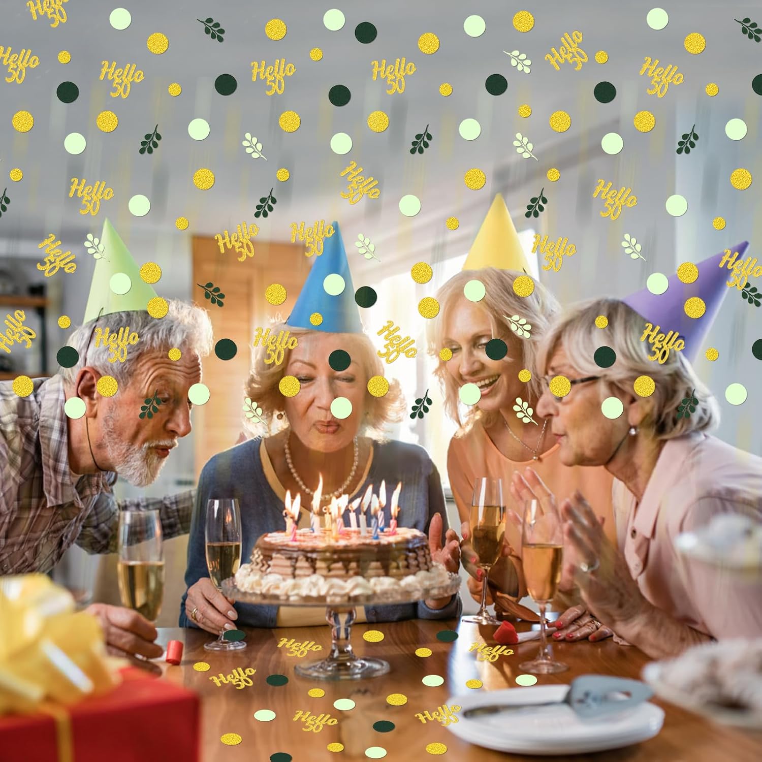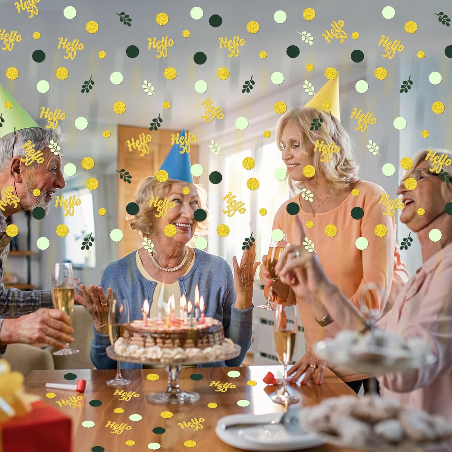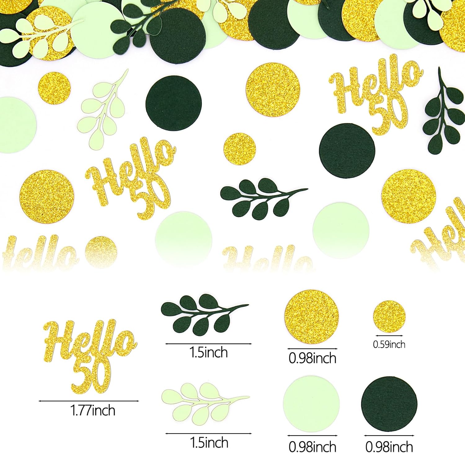• 1.Great Addition to 50 Birthday Party.The green and gold circle dots with hello 50 confetti scatter are shiny and fresh,very sparkle,a perfect addition to 50th birthday theme,nice sage green 50th birthday decorations for women/men.