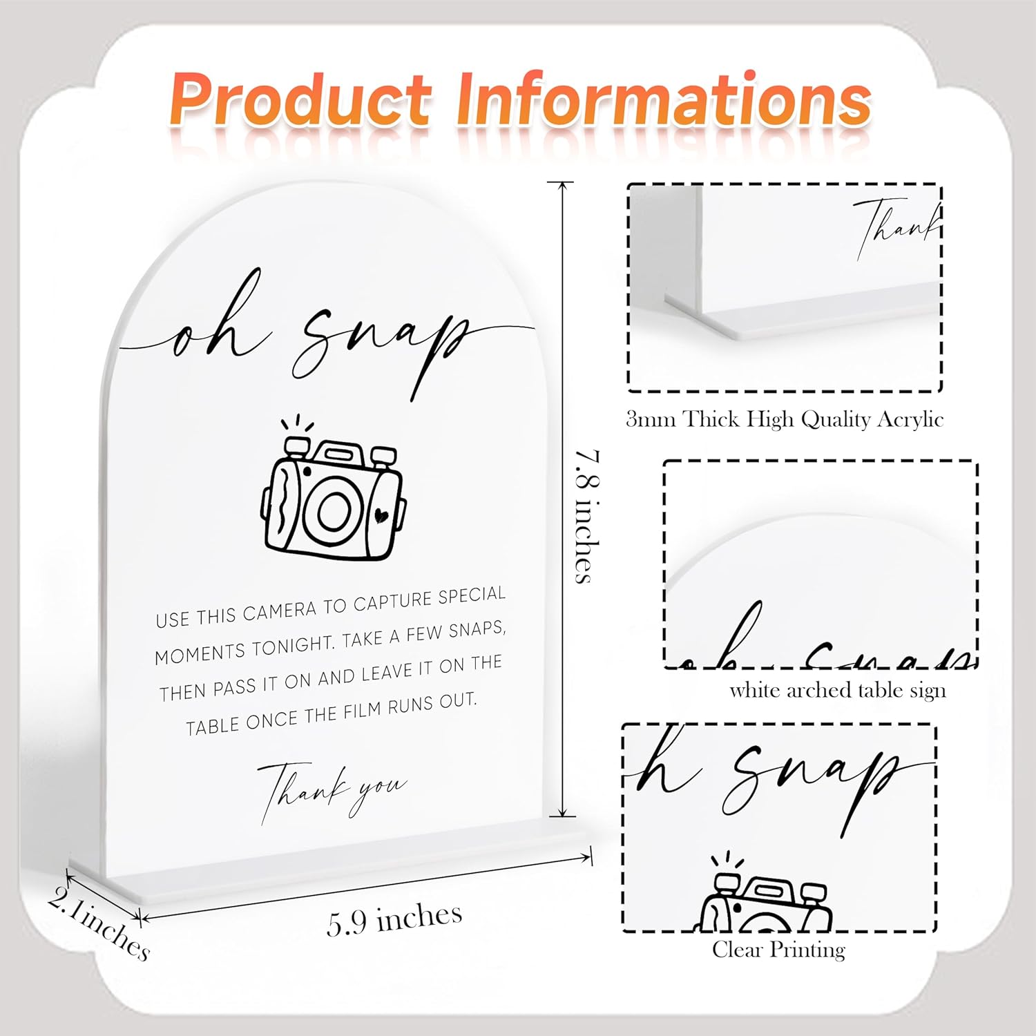 Disposable Cameras for Weddings Sign, White Arch Acrylic Sign, Wedding Reception Decorations, Bridal Shower Decor, Engagement Party Decor, Centerpiece Table Decorations Party for Bride and Groom-23