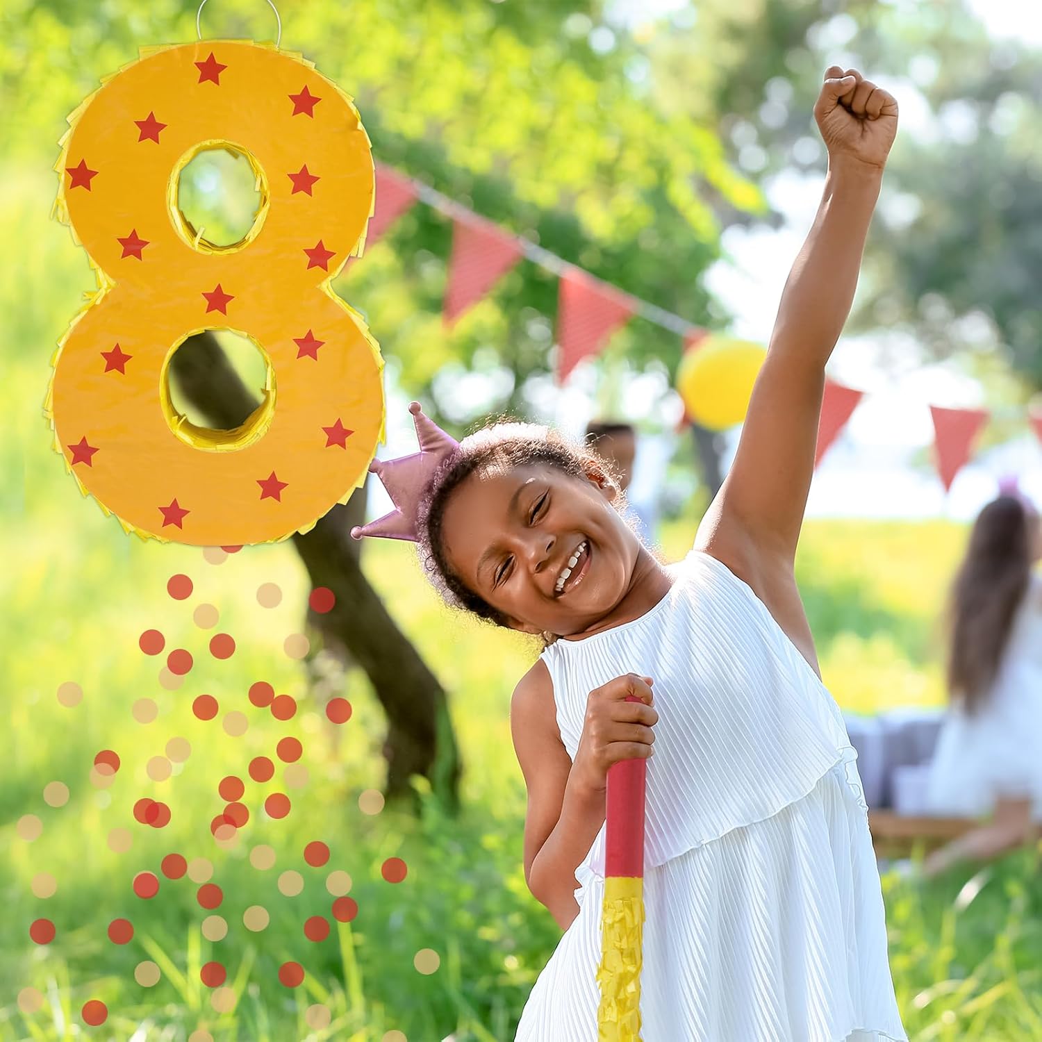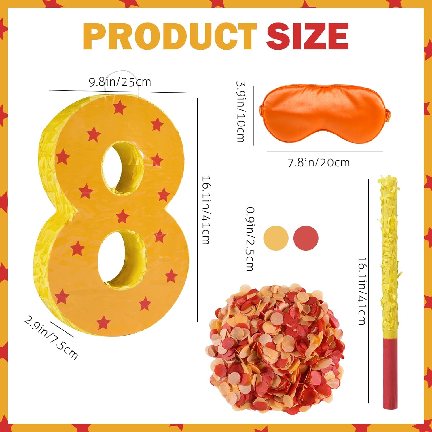 • Package Includes: This set includes a orange and red star number 8 Pinata, 30g confetti,a stick, a blindfold.It is very suitable for creating a cheerful party atmosphere for birthday party.