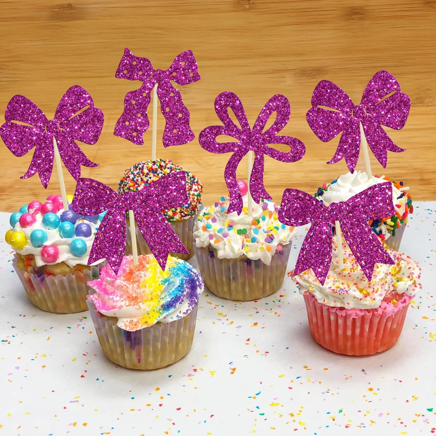 Ephlyn 24Pcs Bow Cupcake Toppers Bow Birthday Cake Topper Girls Birthday Party Decorations Bowknot Cupcake Decorations for Bridal Baby Shower Birthday Wedding Themed Party Purple