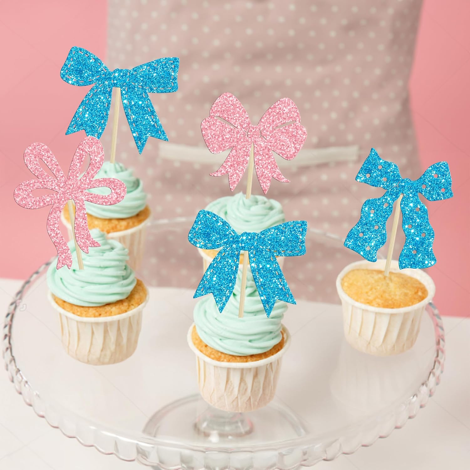 Ephlyn 24Pcs Pink Bow Cupcake Toppers Bow Birthday Cake Topper Girls Birthday Party Decorations Bowknot Cupcake Decorations for Bridal Baby Shower Birthday Wedding Themed Party Pink Blue