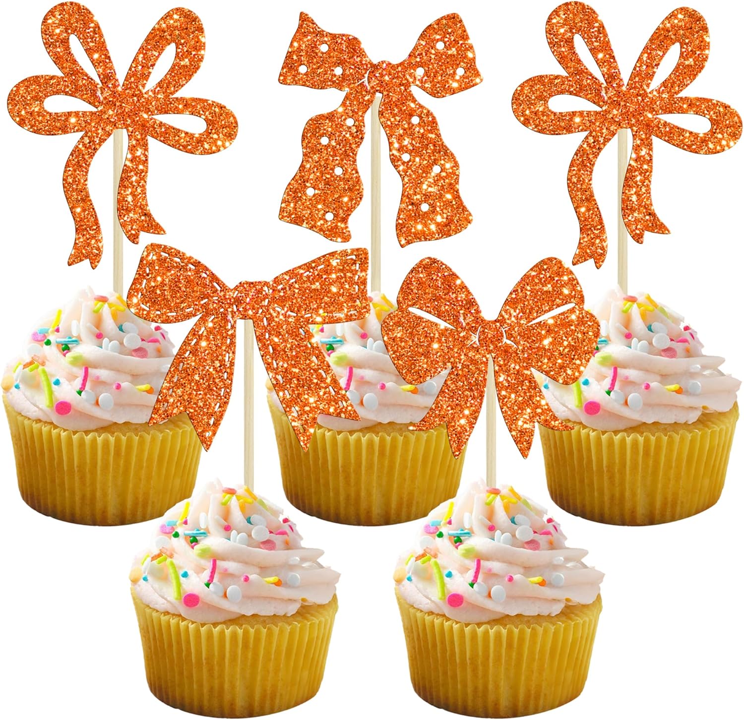 Ephlyn 24Pcs Bow Cupcake Toppers Bow Birthday Cake Topper Girls Birthday Party Decorations Bowknot Cupcake Decorations for Bridal Baby Shower Birthday Wedding Themed Party Orange
