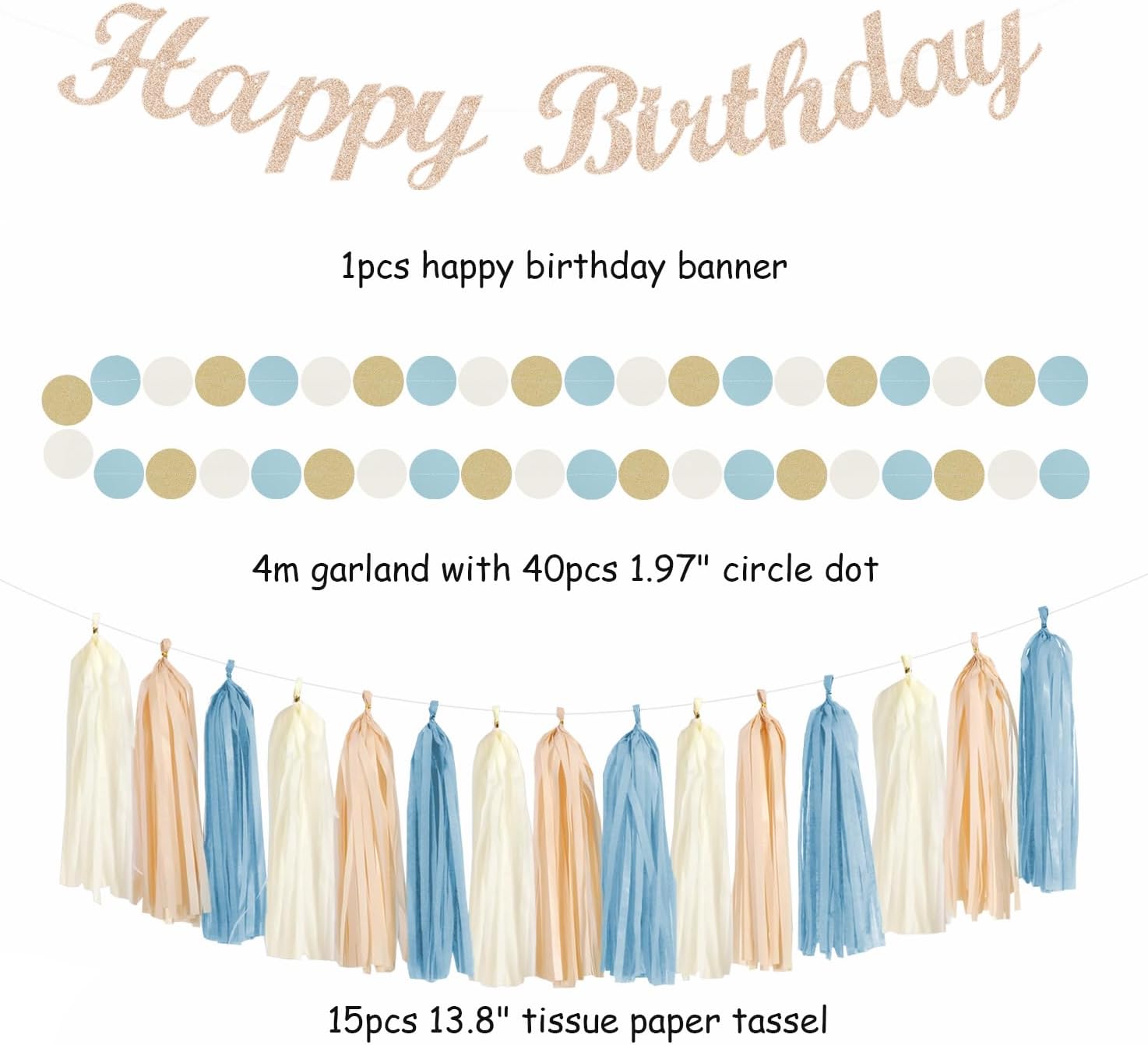 • Package Includes: This kits include 1pcs happy birthday banner, 1pcs circle dots paper banner, paper tassels party garland, 4pcs tissue pom poms flowers, 2pcs paper lanterns, 2pcs paper flower fans, 6pcs paper swirls hanging streamers in light dusty blue beige champagne colors, and different sizes