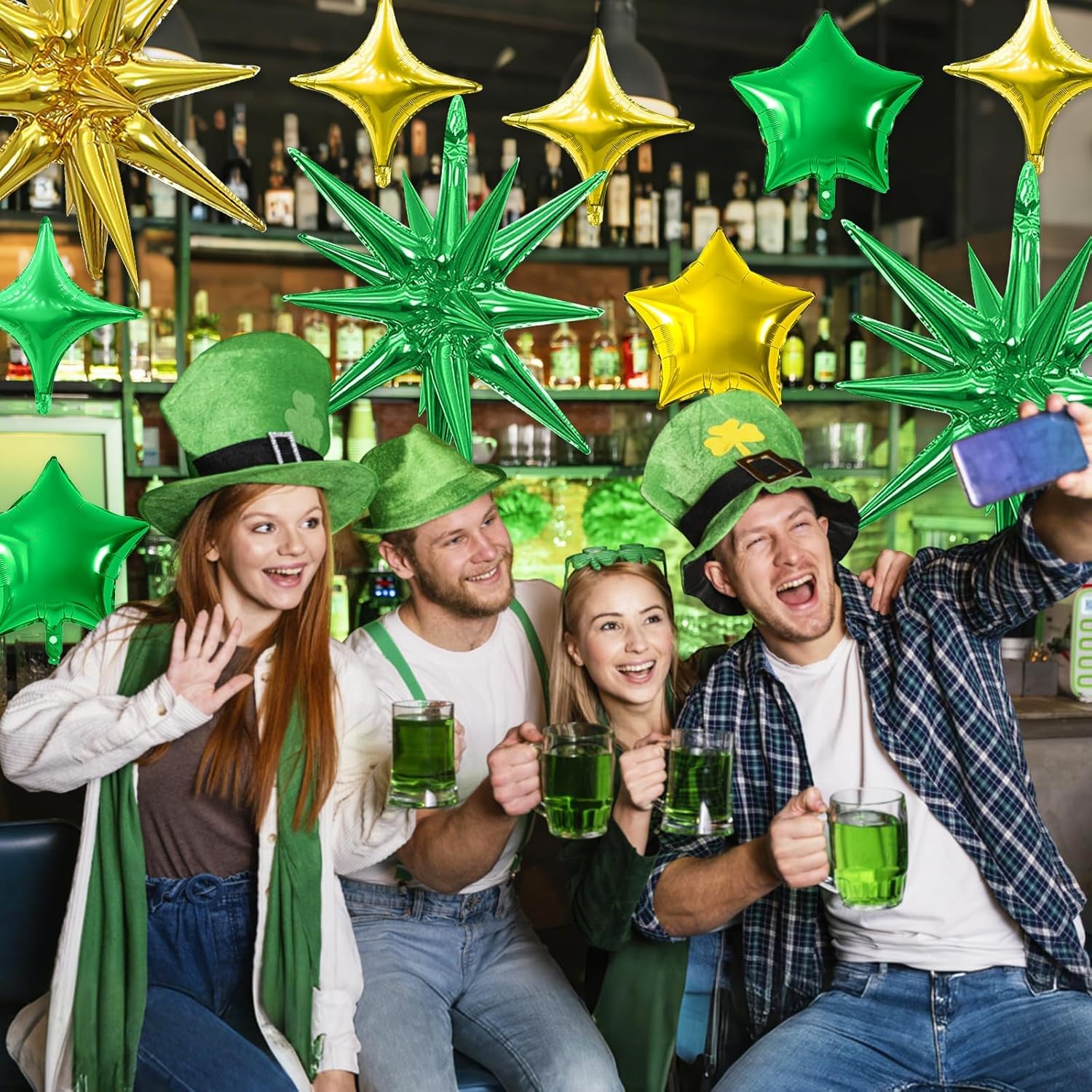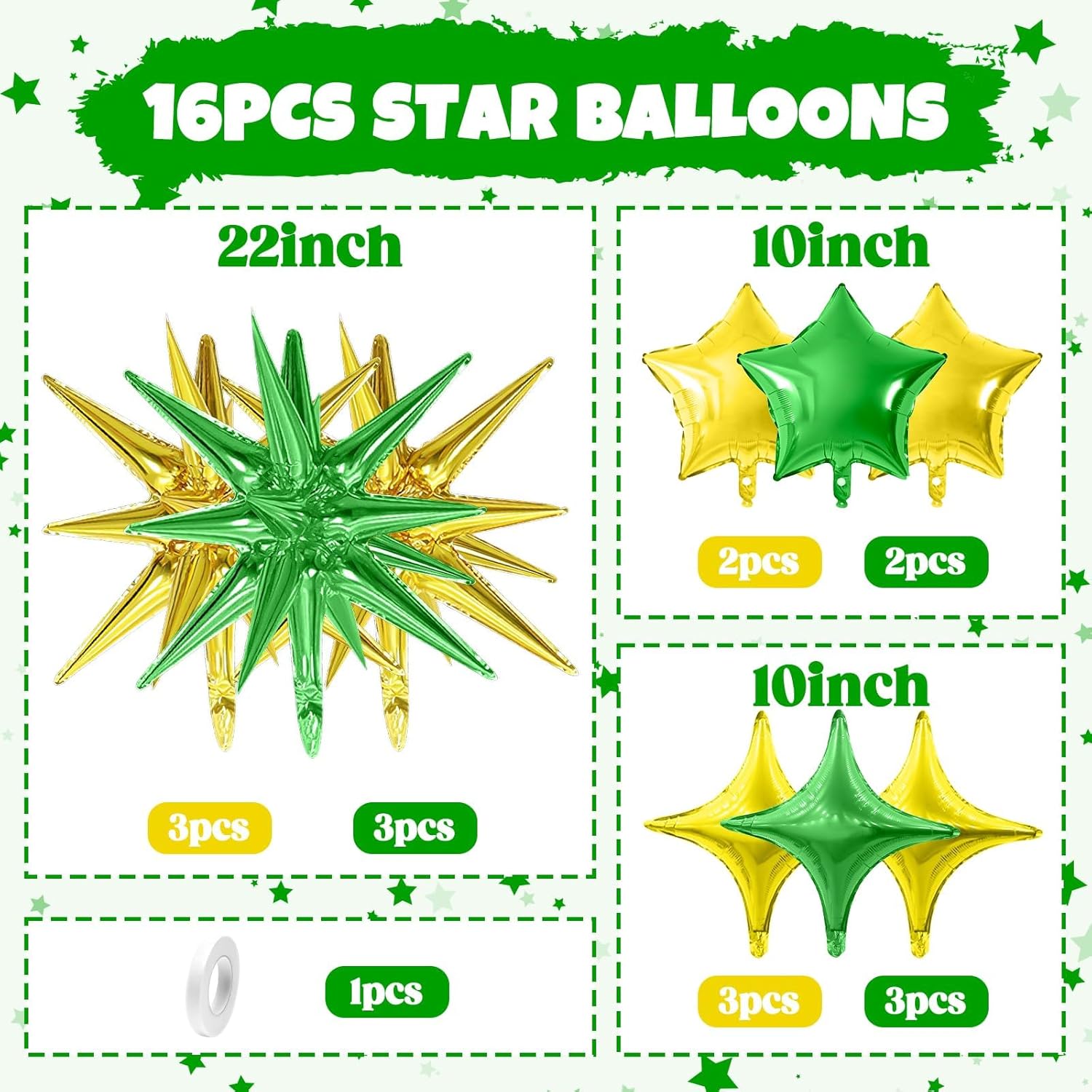 • Package: This set includes 6pcs 22inch explosion star foil balloons(gold*3, green*3), 4pcs 10inch star foil balloons(gold*2, green*2), 6pcs 10inch four angle star balloons(gold*3, green*3), and a ribbon. Perfect for creating a dazzling party atmosphere.