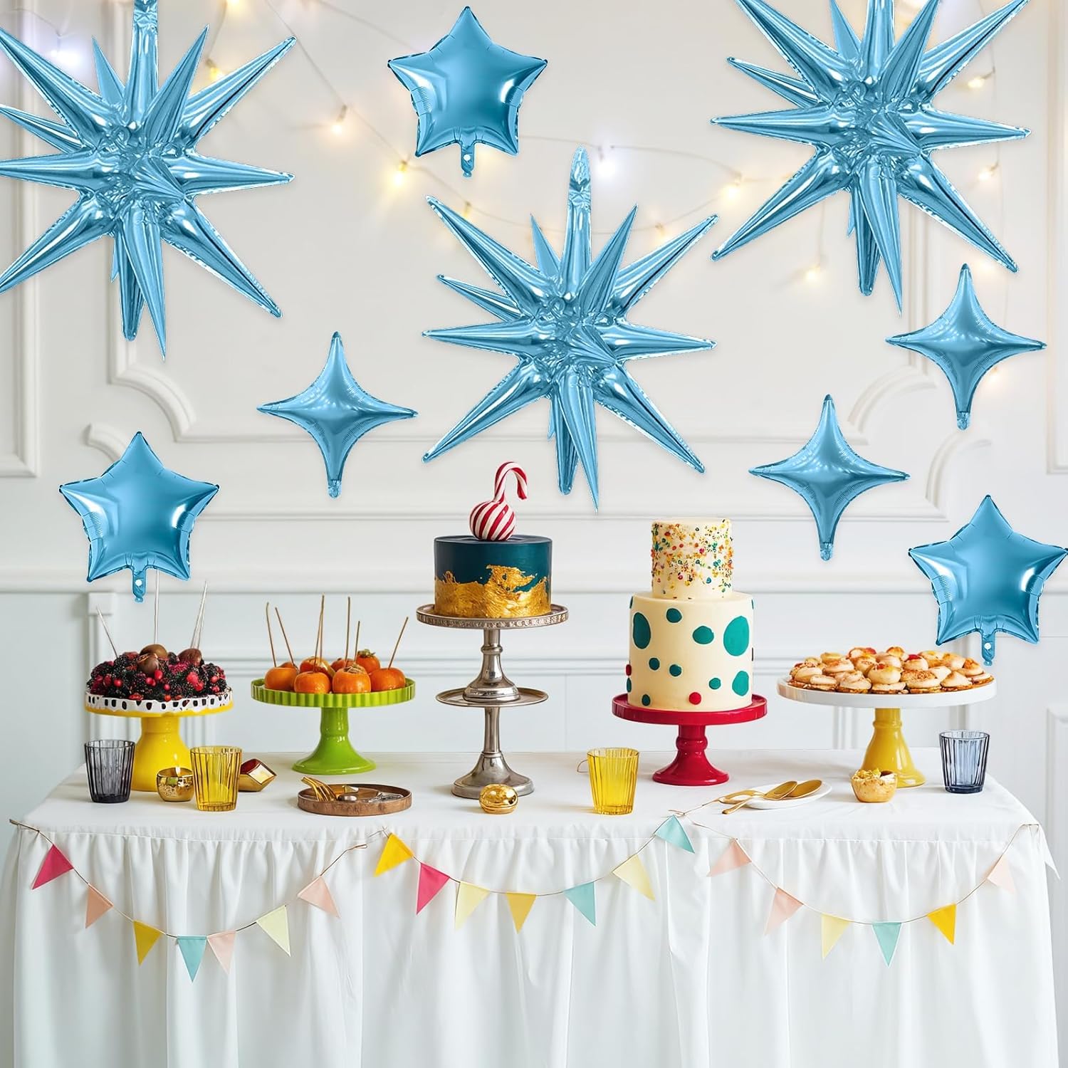 • Package: This set includes 6pcs 22inch blue explosion star foil balloons, 4pcs 10inch blue star foil balloons, 6pcs 10inch blue four angle star balloons, and a ribbon. Perfect for creating a dazzling party atmosphere.