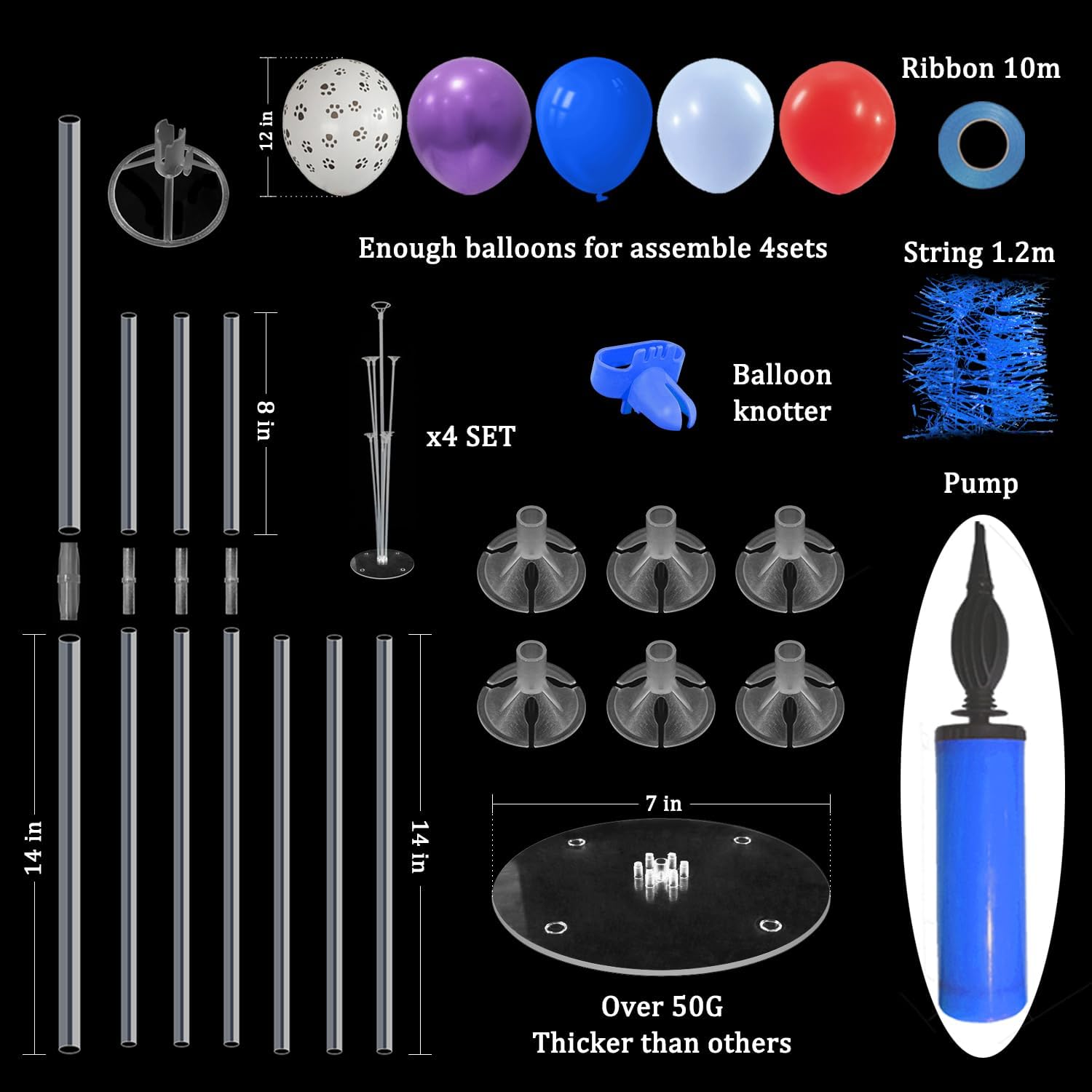 • WHAT INLCUDE: This balloon stand kit include 4 set balloon holders, 35 pcs balloons - blue red purple puppy paw balloons, balloon pump, ribbons, glue dots and tie tool