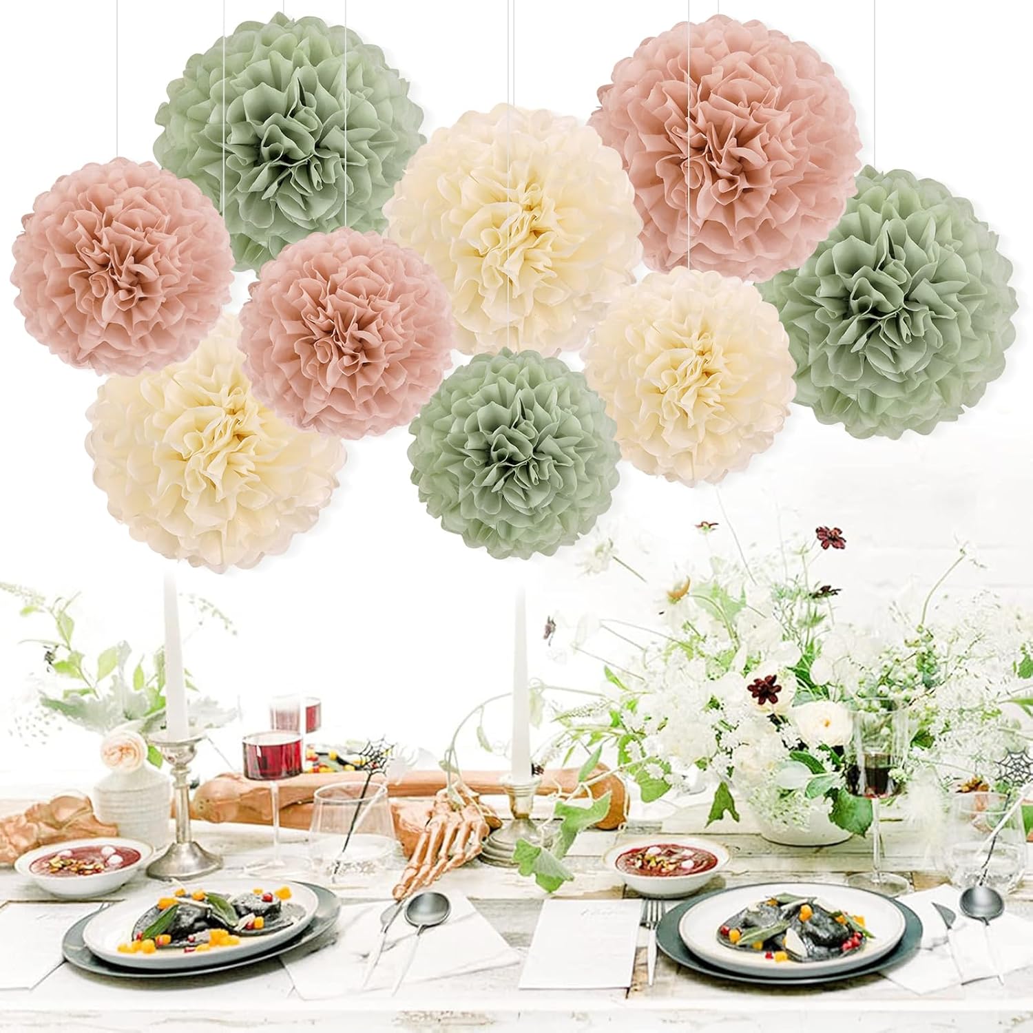 • Sage Green Tissue Pom Poms Set - Product Composition:15 premium tissue pom poms in sage green, dusty pink and beige - complete bohemian decor package for instant themed party transformations.