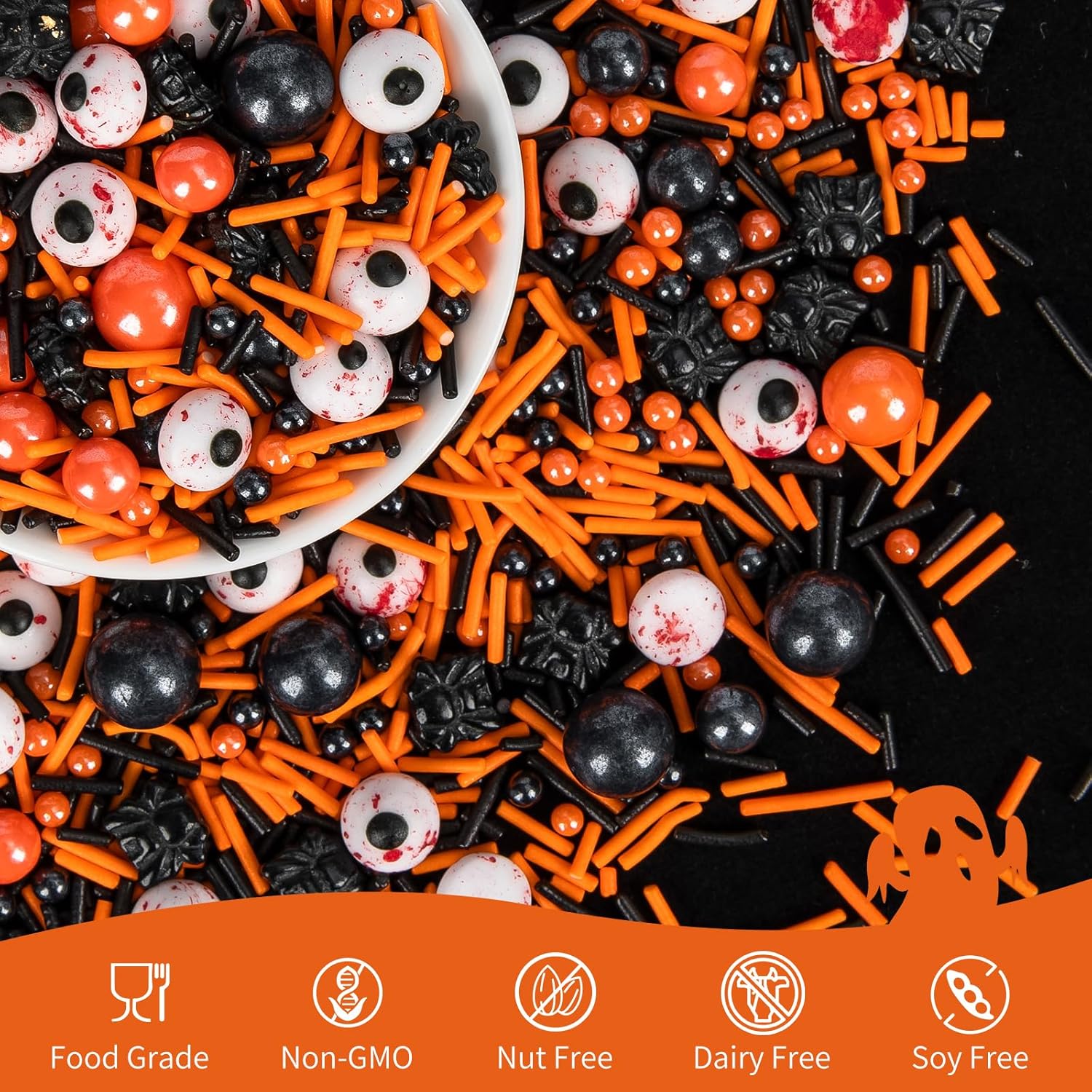Halloween Terrifying Sprinkles,Candy Bloody Eyeballs,Orange Pearls Black Spider Sprinkle Edible Jimmies Mix,Perfect for Cake Decorations, Baking, Ice Cream, Cookies, Cupcake Topper,Halloween Supplies Children's Party,130g/4.58ounce