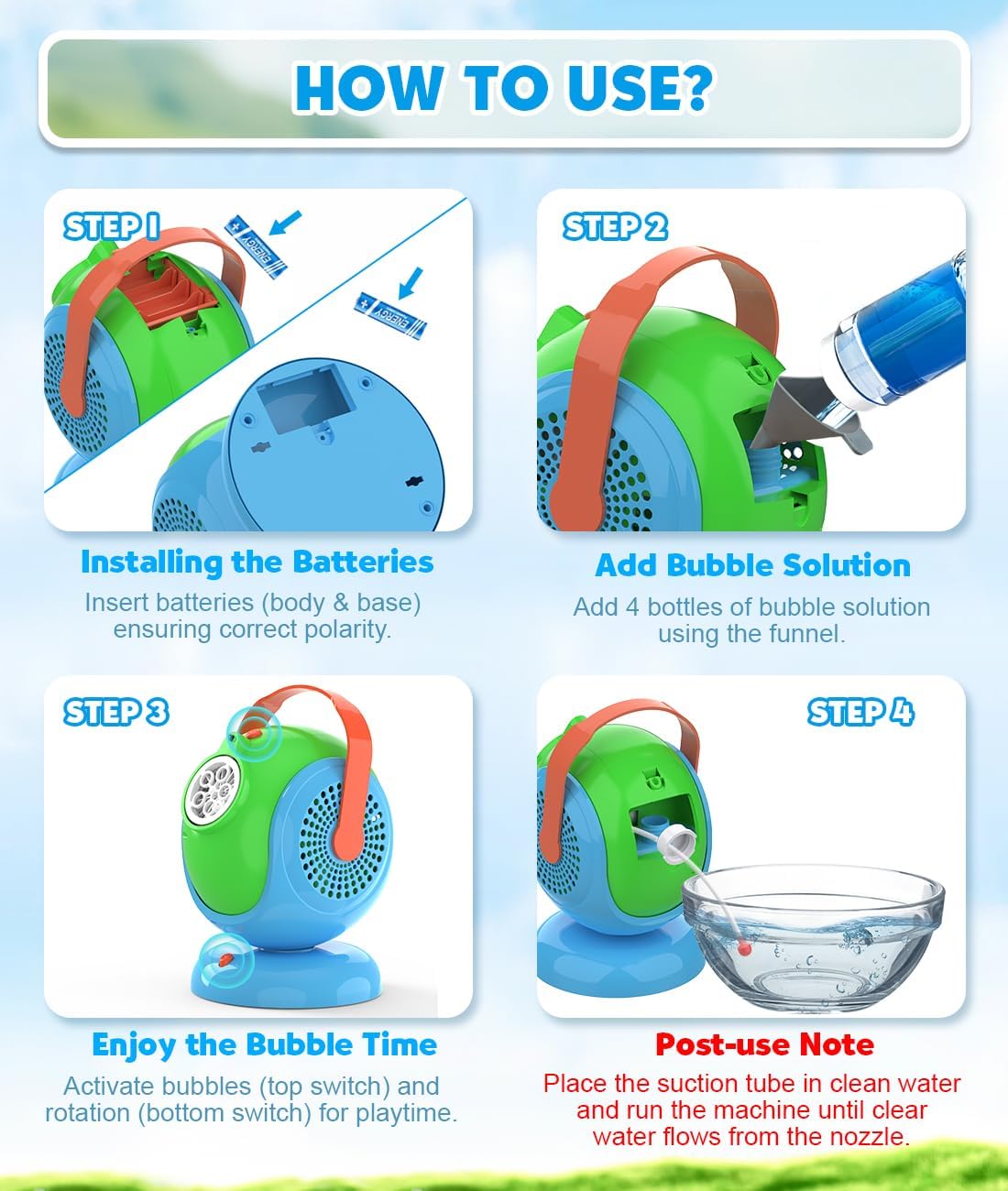 • Ideal Gift for Kids Ages 3 and Up - This bubble machine is more than just a toy, it is an ideal gift for children on all occasions. Whether it is a birthday, Easter or Halloween, it is sure to bring joy and laughter and create unforgettable memories for little ones.