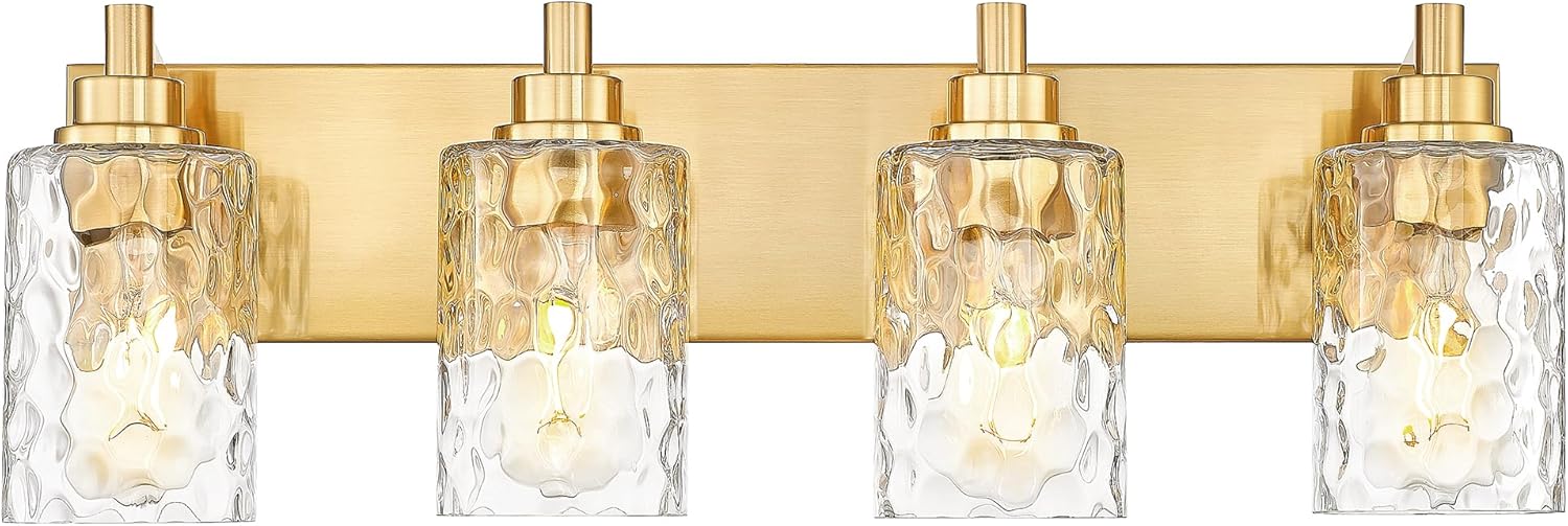 • Inspired Design: The 4-light bathroom vanity light feature a combination of clear hammered glass cylinder shades and a brushed gold metal long base back plate, creating a fusion of timeless elegance and modern minimalism. The bathroom lighting fixtures over mirror are sure to add a touch of unique charm and ambiance to your space