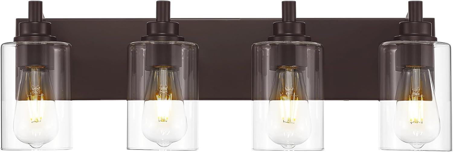 • Inspired Design: The 4-light bathroom light fixtures over mirror features a oil rubbed bronze long base metal frame and elegant cylinder clear glass shades, seamlessly fitting modern minimalist decor. You can install it upwards or downwards for versatile style