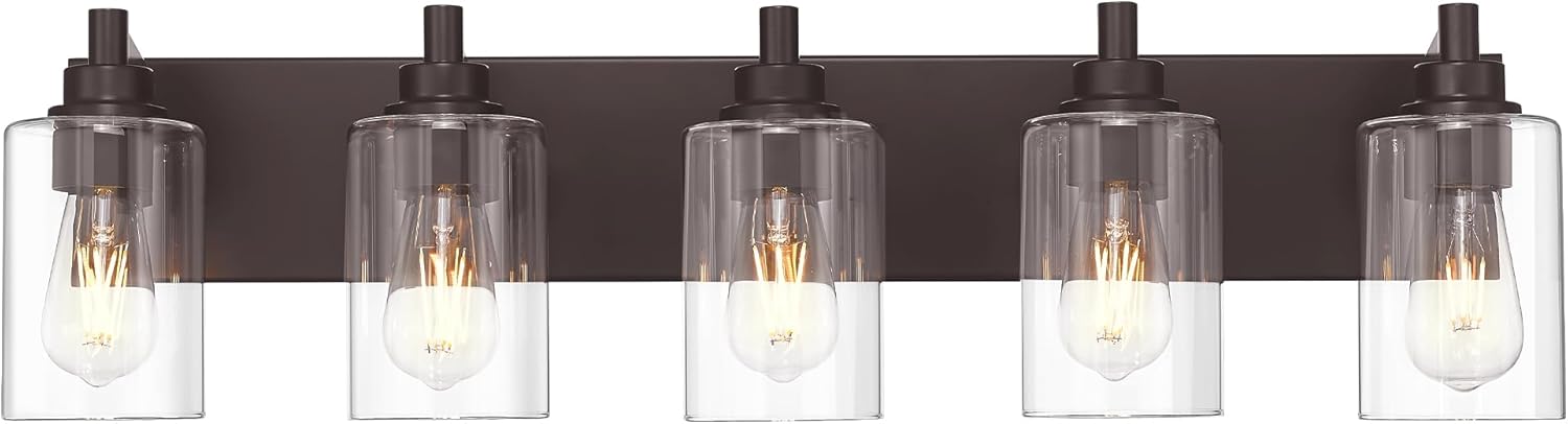 • Inspired Design: The 5-light bathroom light fixtures over mirror features a oil rubbed bronze long base metal frame and elegant cylinder clear glass shades, seamlessly fitting modern minimalist decor. You can install it upwards or downwards for versatile style