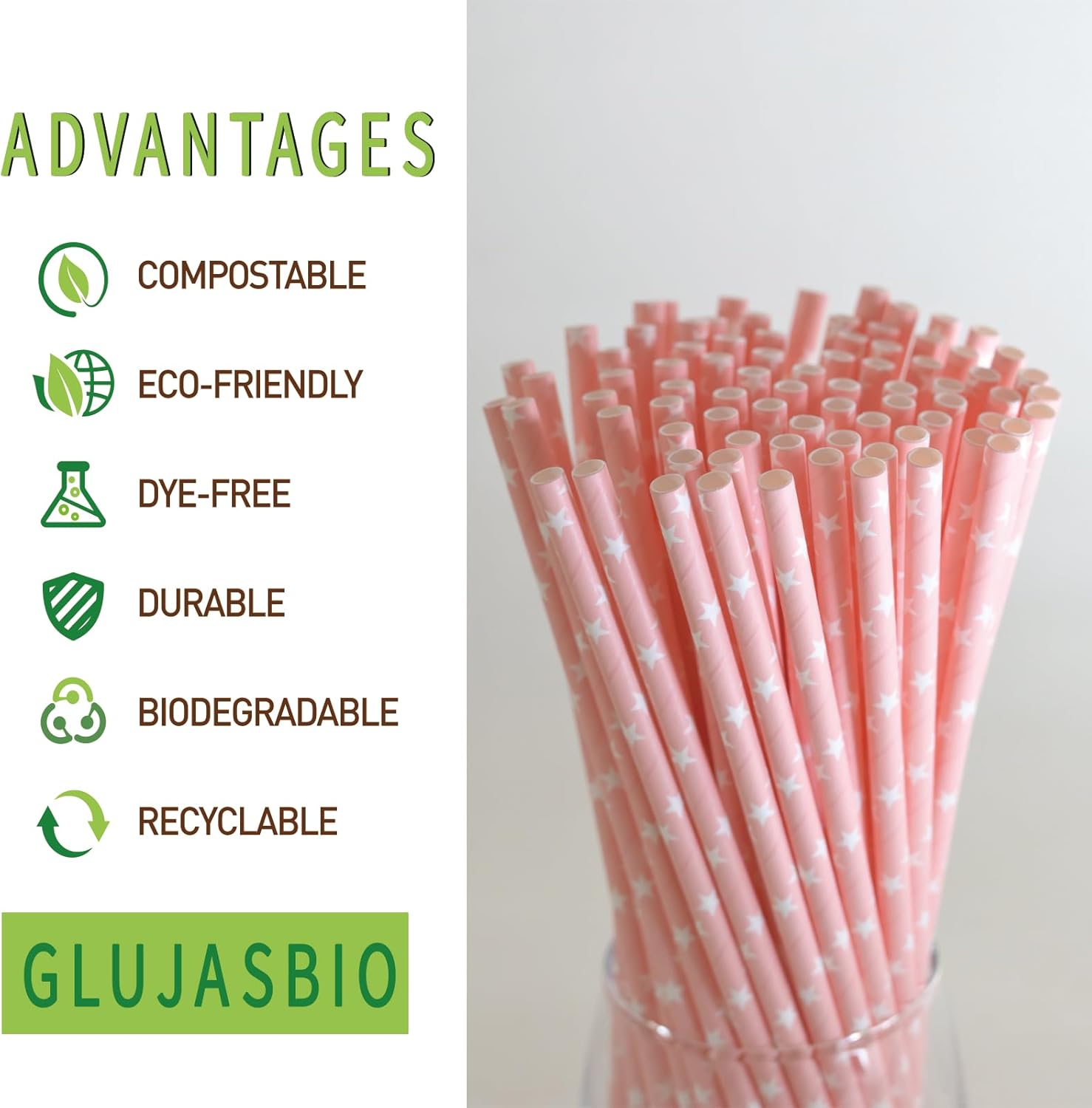Pink Straws Disposable Biodegradable Star Paper Straws for Cocktail, Coffee, Juice, Lemonade, 100 Pack, 7.75" x 0.24"