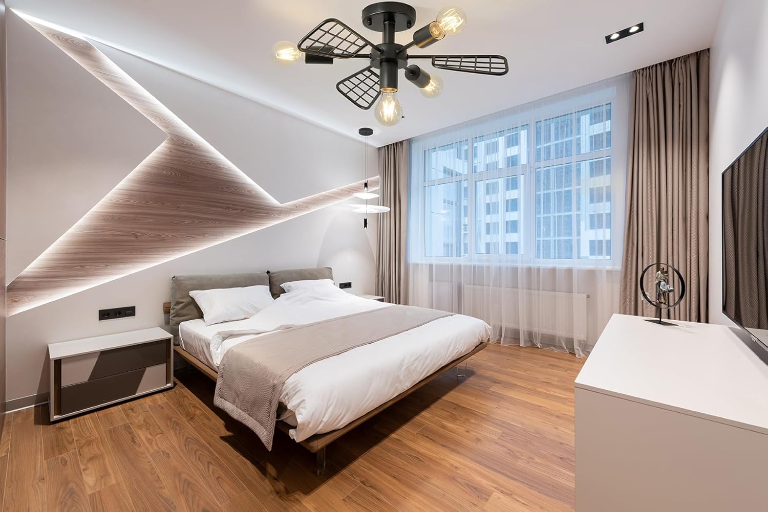 • 💚Why choose us?【MODERN DESIGN】: Unique geometry design ceiling light fixture featuring Fan-shaped veneer in matte black finish for contemporary farmhouse style