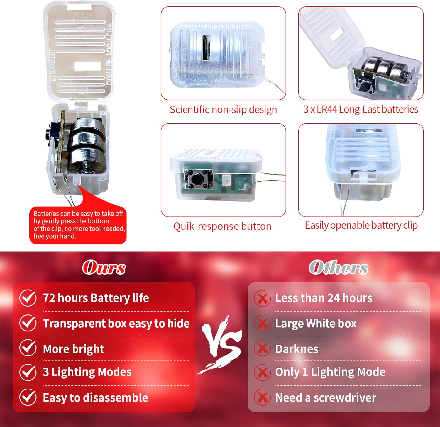 • 3 LIGHTING MODES AND WAIDELY APPLICATION: The fairy lights are super convenient enables to switch 3 flashing modes, Fast Twinkling, Slow Twinkling and Constant Lighting; This versatile battery operated lights can be used for Christmas decoration, holiday, Halloween parties, Valentine's Day, wedding, bedroom and centerpiece table decorations. Giving you different decorative effect and romantic atmosphere