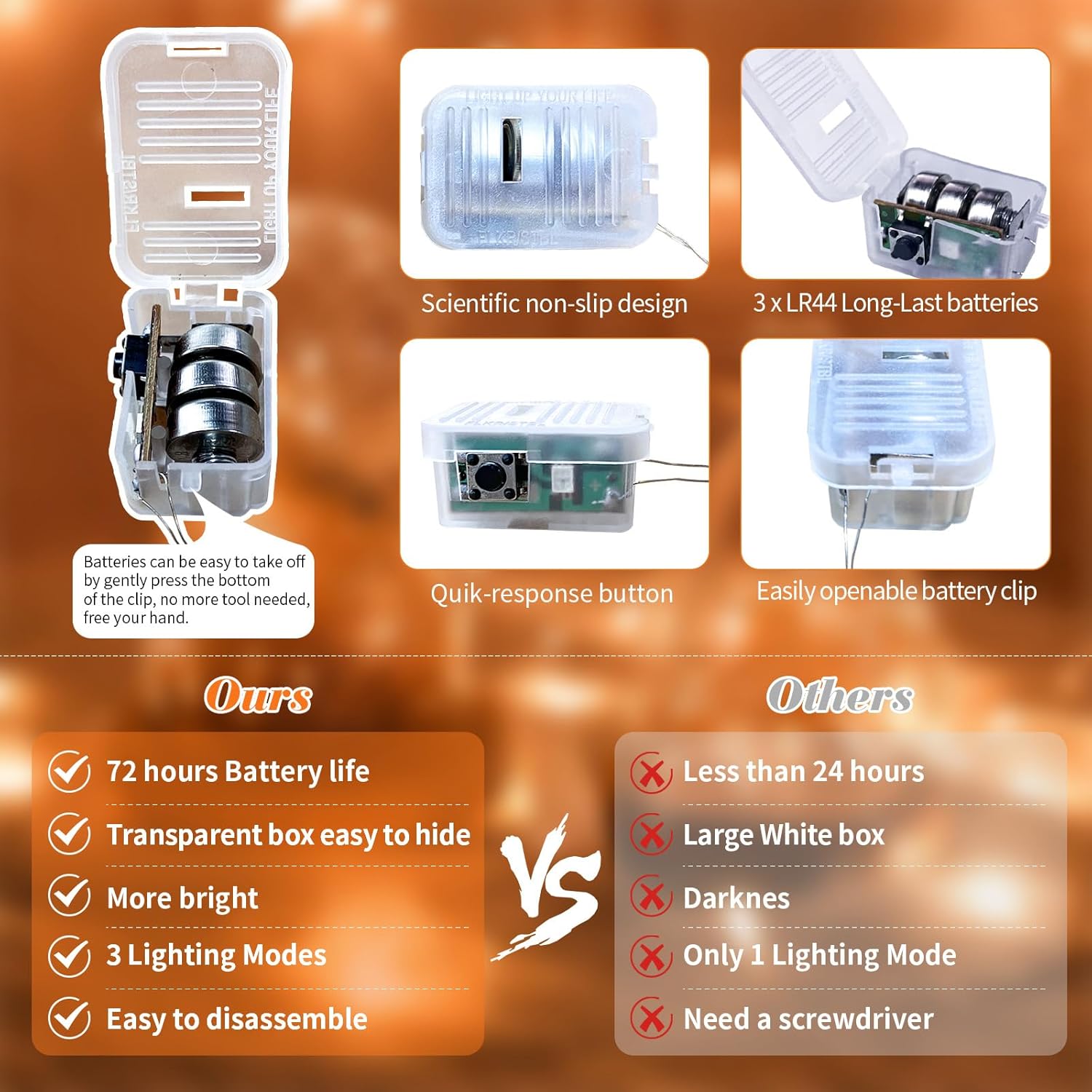 • IP65 WATERPROOF AND INDIVIDUALLY WRAP: The battery fairy lights are waterproof can be used for Indoor/Outdoor. (the battery pack is not waterproof) safe to the touch. Made of soft bendable wire so you can easily bend into any shape or wrapped it on anything such as Christmas trees, wine bottle, pumpkins, guirlande lumineuse interieure, potted landscape etc.Each light is individually packaged, say goodbye to cable tangles and bring more happiness and satisfaction to your family and friends