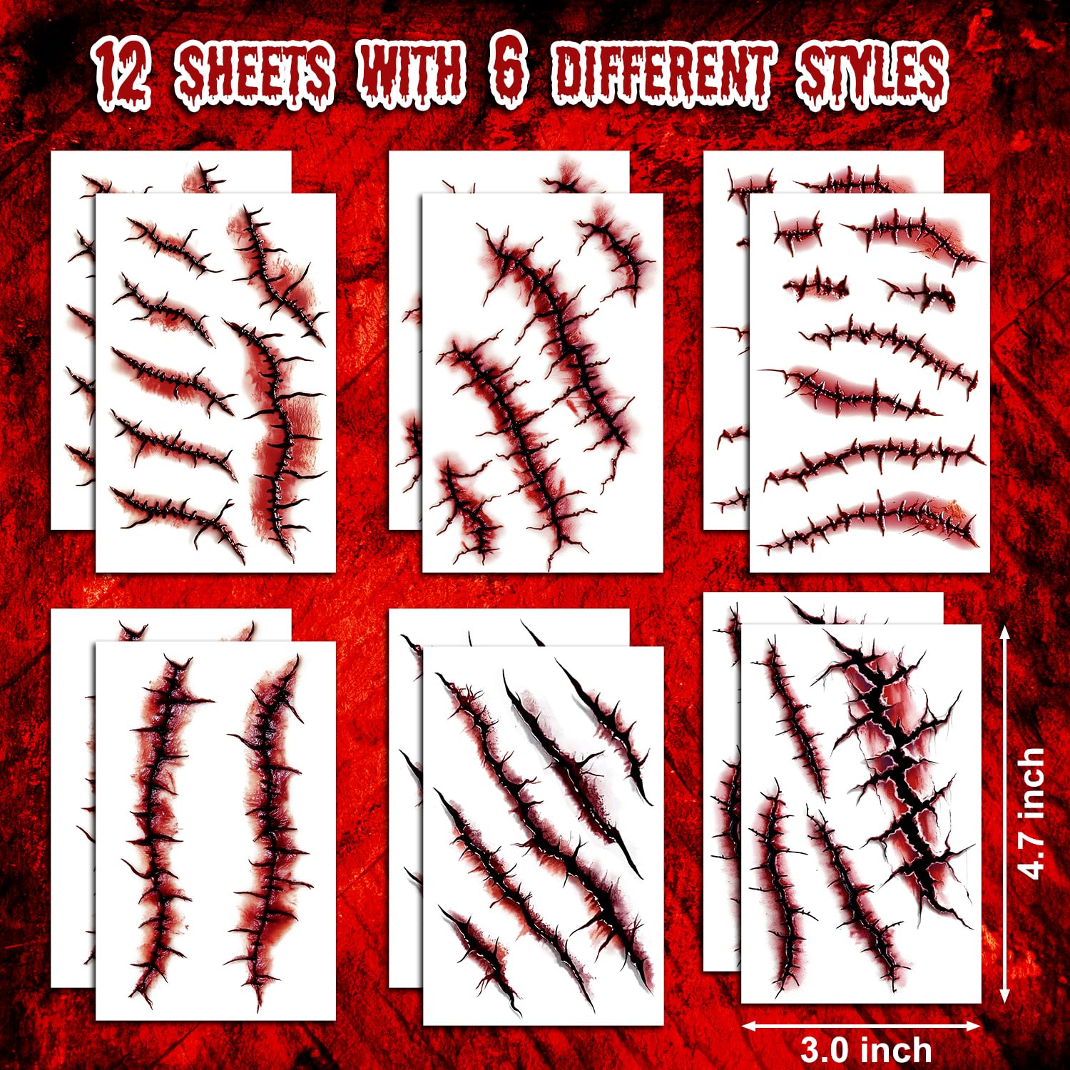JCFIRE 12 Sheets Halloween Makeup Kit, Fake Scars Halloween Temporary Tattoos for Kids Adults, Zombie Costume for Kids Women, Tattoos Stickers Party Decorations Supplies Accessories