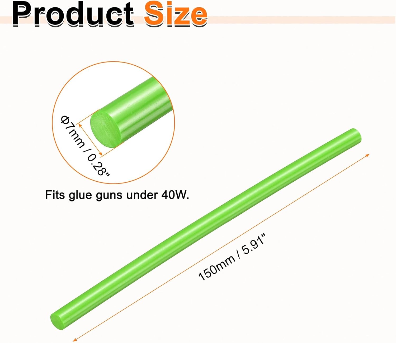 • Size - Hot glue sticks size: 7 x 150mm / 0.28 x 5.91 inch (D*L); Curing time: 10–15 seconds; Working temperature: 150°C (302°F); Softening point: 75°C (167°F).