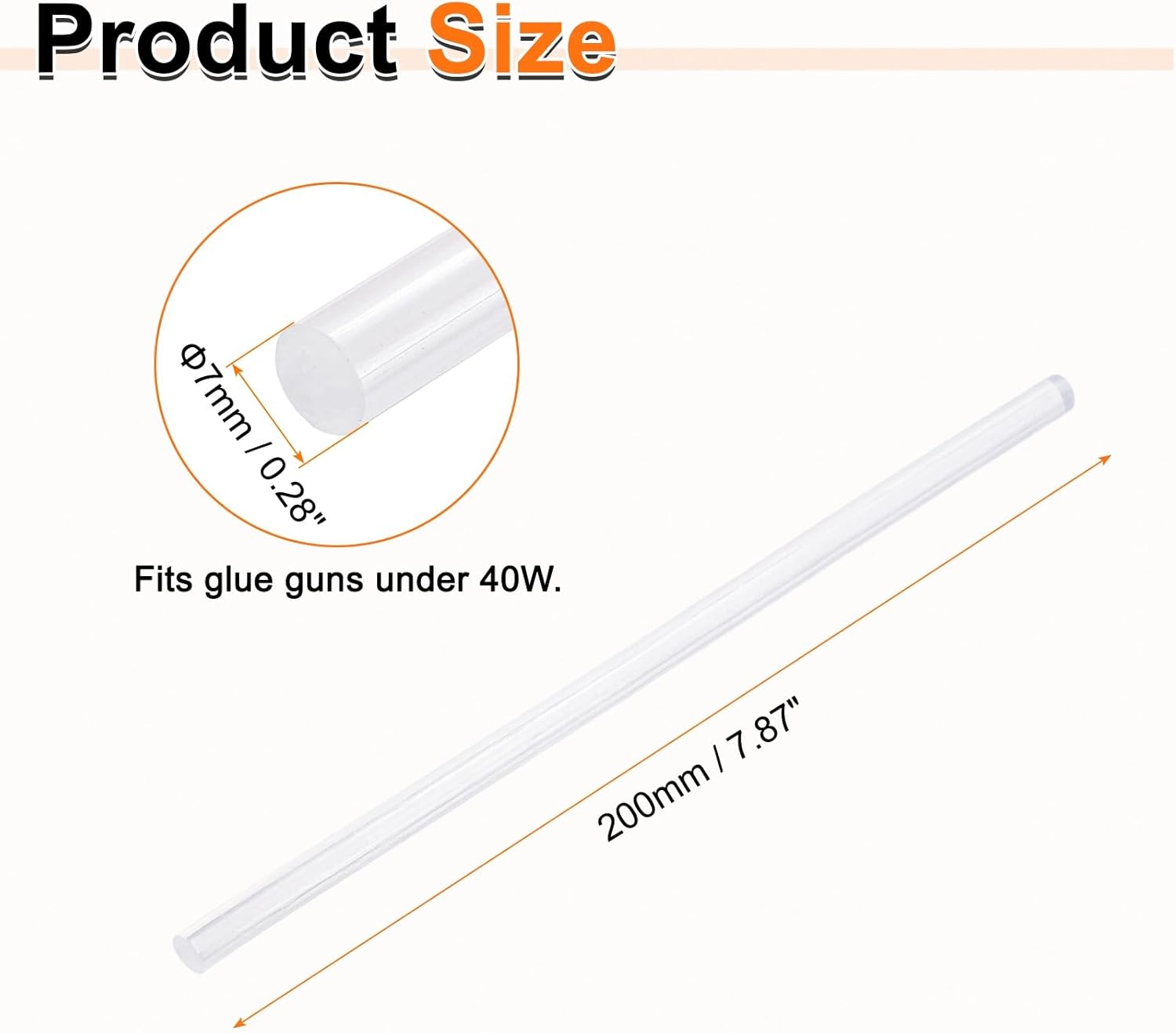 • Size - Hot glue sticks size: 7 x 200mm / 0.28 x 7.87 inch (D*L); Curing time: 10–15 seconds; Working temperature: 150°C (302°F); Softening point: 75°C (167°F).