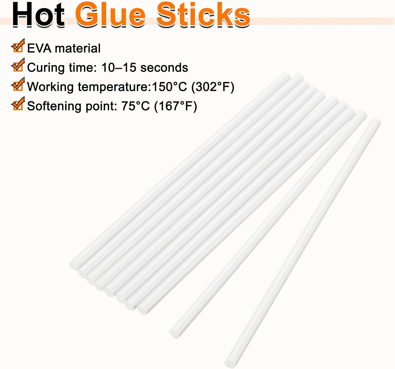 • Size - Hot glue sticks size: 7 x 200mm / 0.28 x 7.87 inch (D*L); Curing time: 10–15 seconds; Working temperature: 150°C (302°F); Softening point: 75°C (167°F).