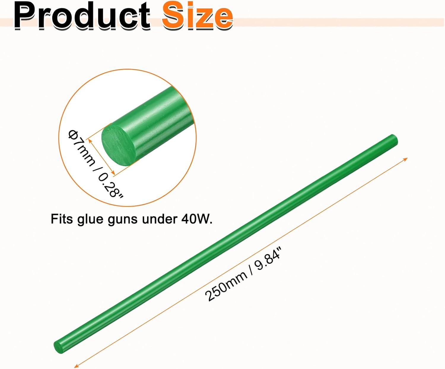 • Size - Hot glue sticks size: 7 x 250mm / 0.28 x 9.84 inch (D*L); Curing time: 10–15 seconds; Working temperature: 150°C (302°F); Softening point: 75°C (167°F).