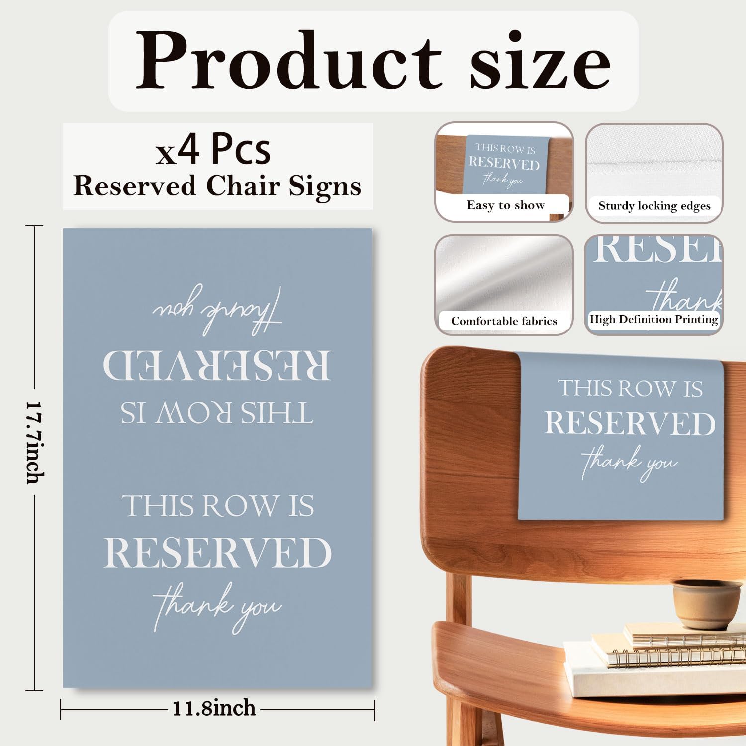 • Universal Size: Each reserved seat sign measures approx. 30 x 45 cm / 11.81 x 17.72 inches, suitable for most standard chairs, pews, or benches. The large, clear lettering ensures your message is easily seen by guests from a distance.