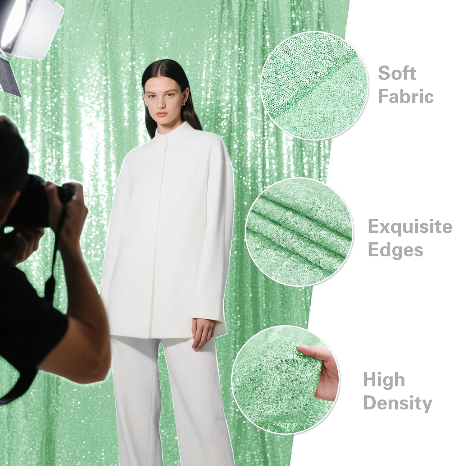 • Durable Material: The sequin backdrop is made of 3MM round density sequins with mesh fabric backing. All sides are well folded and sequins are not easy to drop which can be reused.
