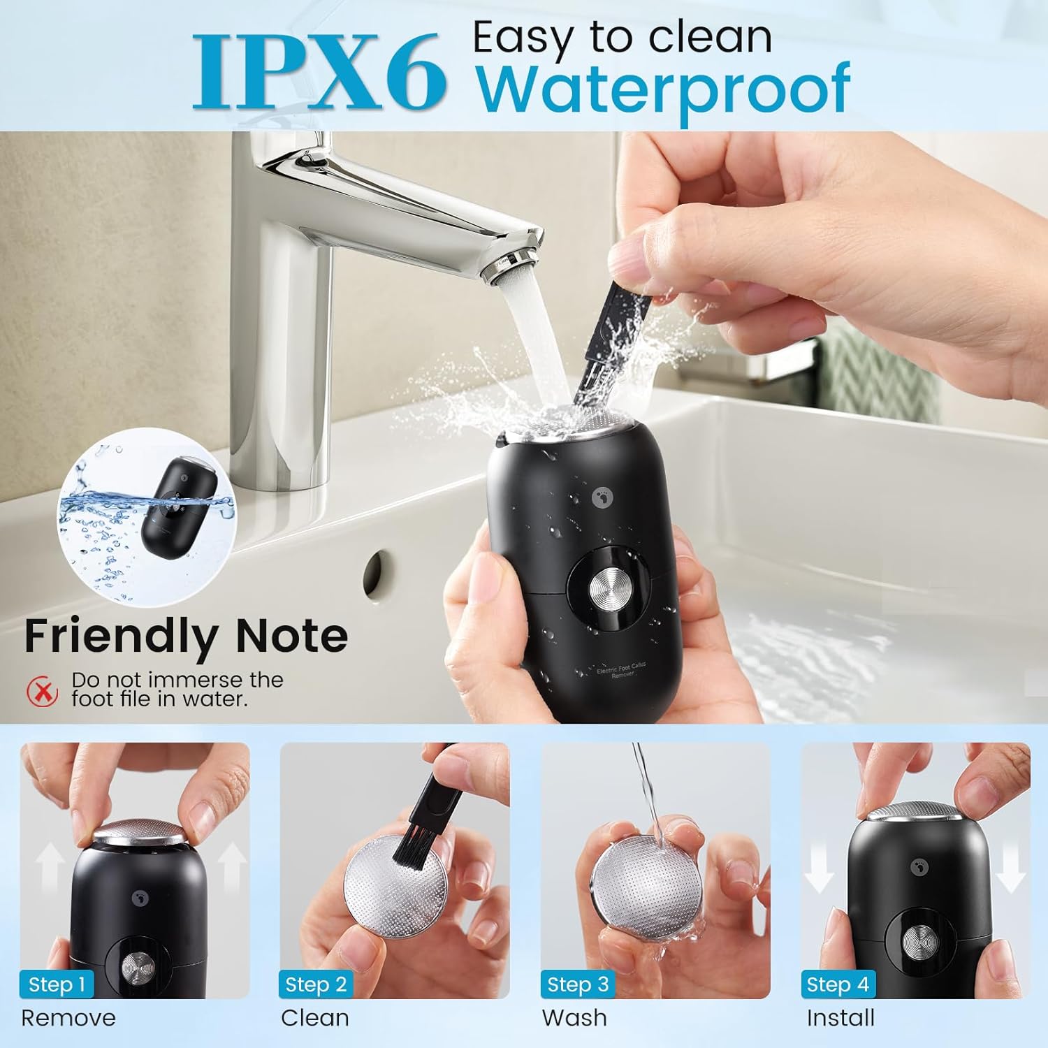 • IPX6 Waterproof Foot File-Wet or Dry Use: The high-speed grinding head removes calluses from dry or wet feet with a light touchβ€”no need for heavy rubbing . After use, simply rinse it under the faucet; debris washes away instantly, eliminating the hassle of manual cleaning.​ Note: Keep it away from the charging port to avoid soaking and extend its lifespan.