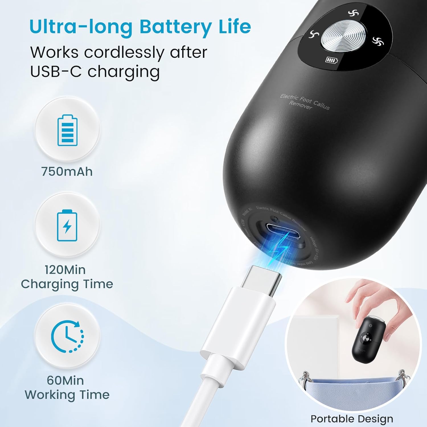 • Type-C Charging & Wireless Convenience: This electric foot callus remover comes with Type-C fast charging technology. Its smart display shows real-time battery levels, so you won’t be caught off guard by sudden shutdowns during use. What’s more, once charged, it works wirelessly and with its compact size, it’s easy to carry anywhere and using anytime.