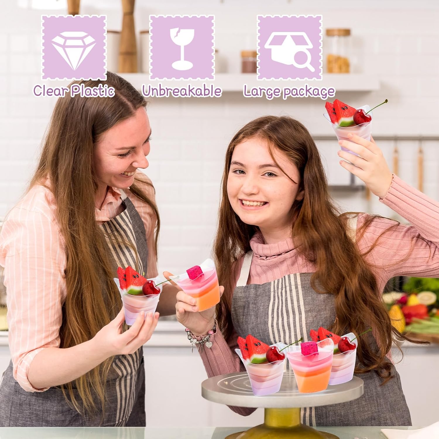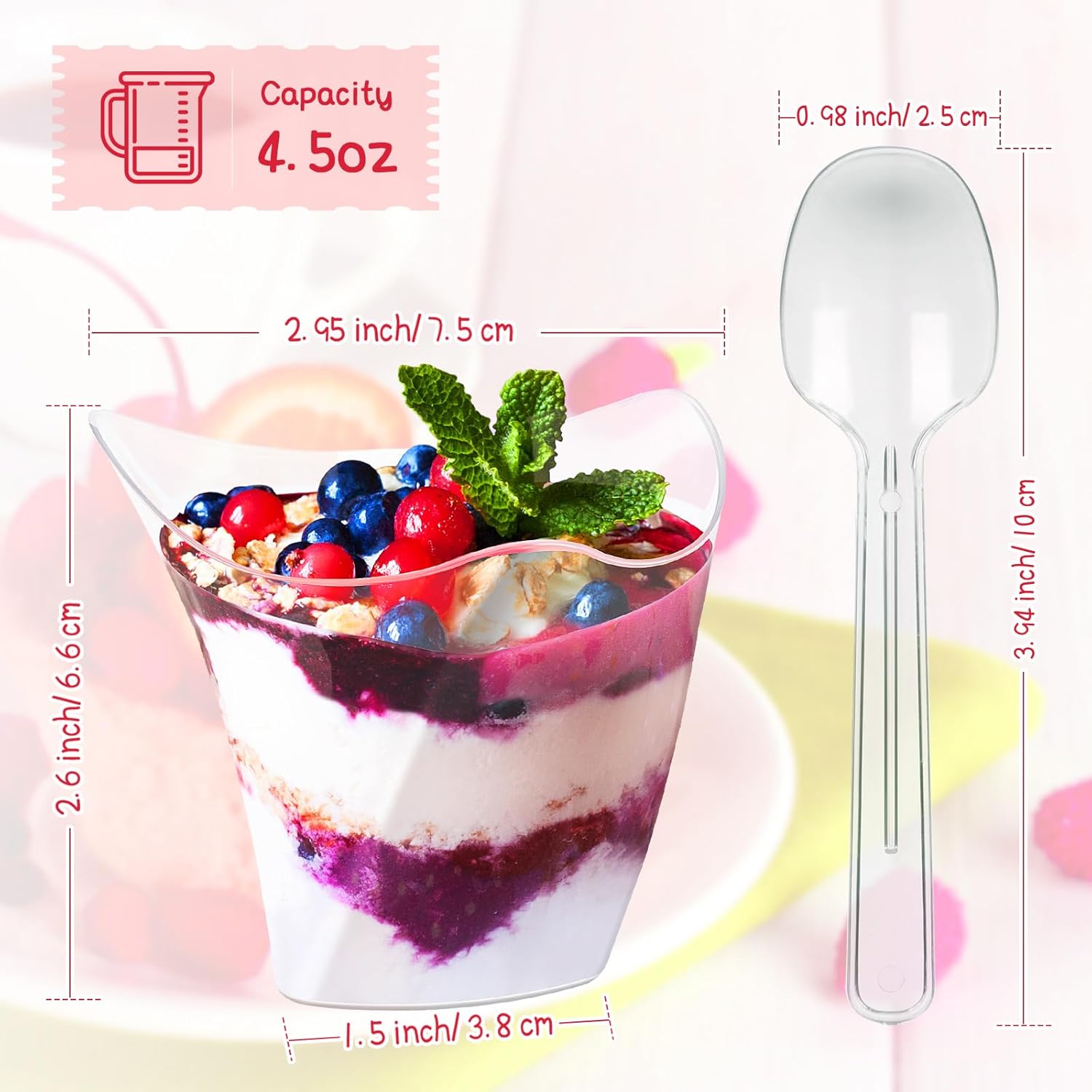 • Quality Material: made of plastic, these mini dessert cups are reliable, safe and non BPA; You can pack all kinds of desserts and fruits; Each spoon and OPP bag independent packaging are clean and hygienic; The quality plastic is not easy to break; These plastic dessert cups are lighter than glass cups, so that adult does not have to worry about holding them