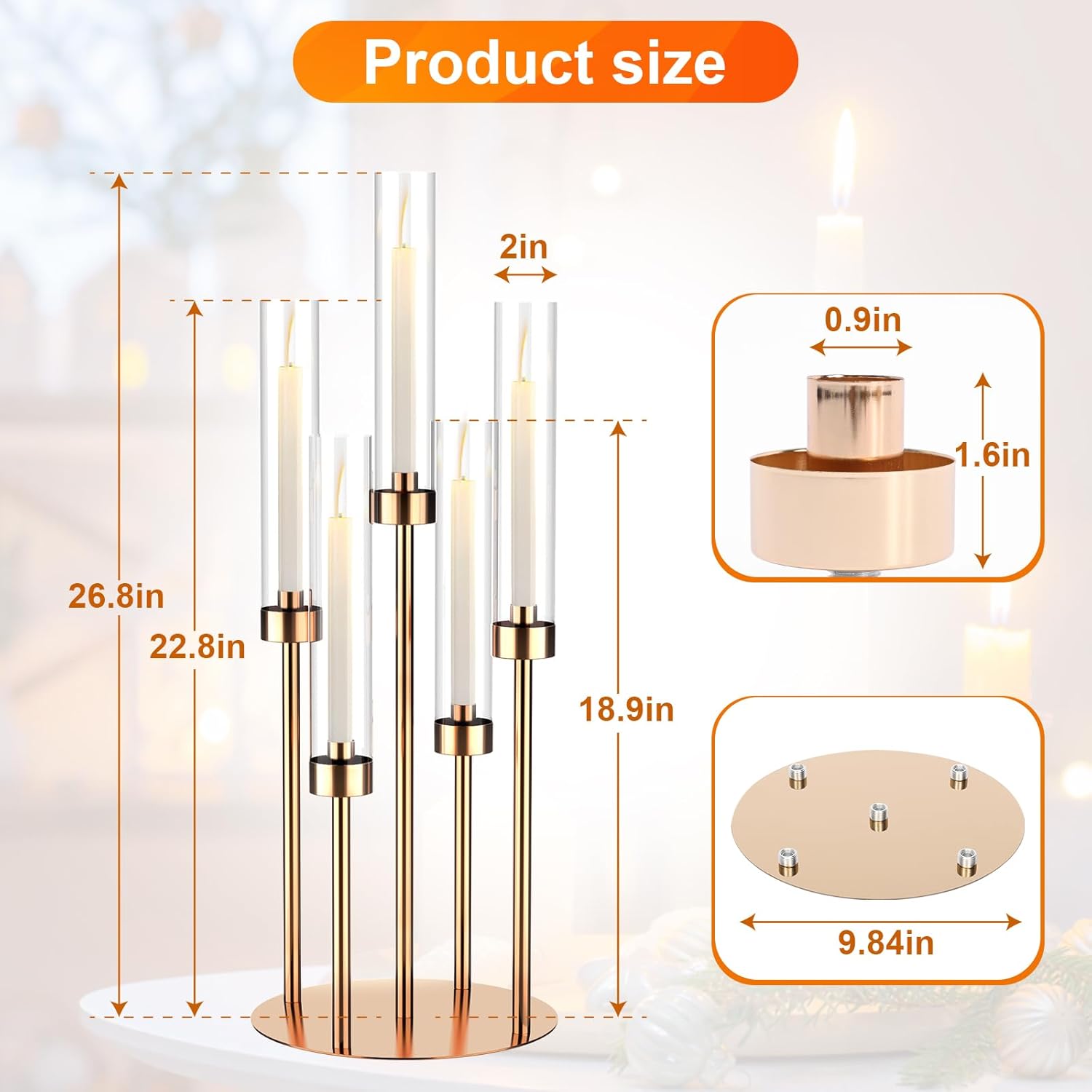 • 4 SET 5 ARM FLOOR CANDELABRAS : our floor candelabra is 4 pieces set of 5 head candle holders, the product has 3 heights, which are 25.98in, 22.02in, 18.11in, very suitable size. Each candle holder contains 5 removable shades, the height is 9.8in, the diameter is 2in, the whole set is perfect for many occasions