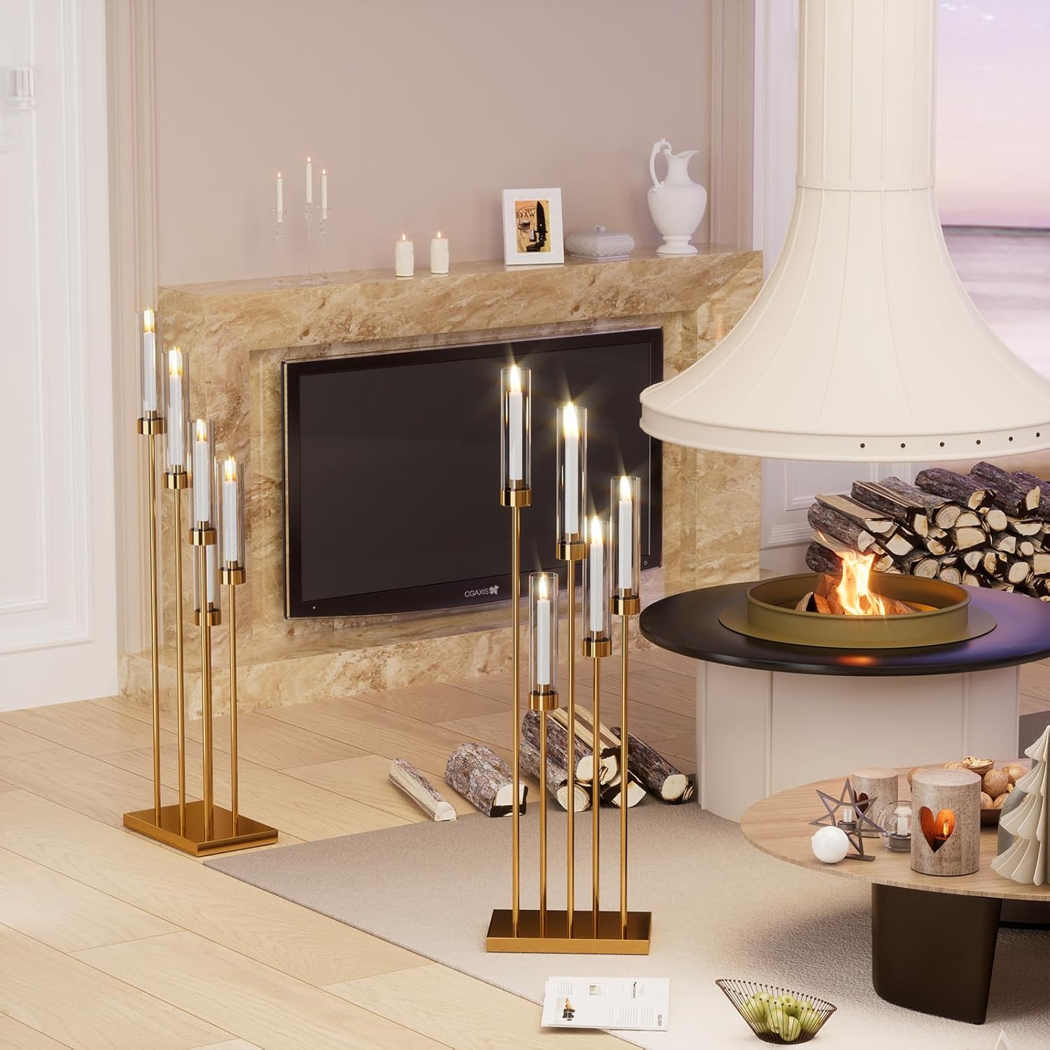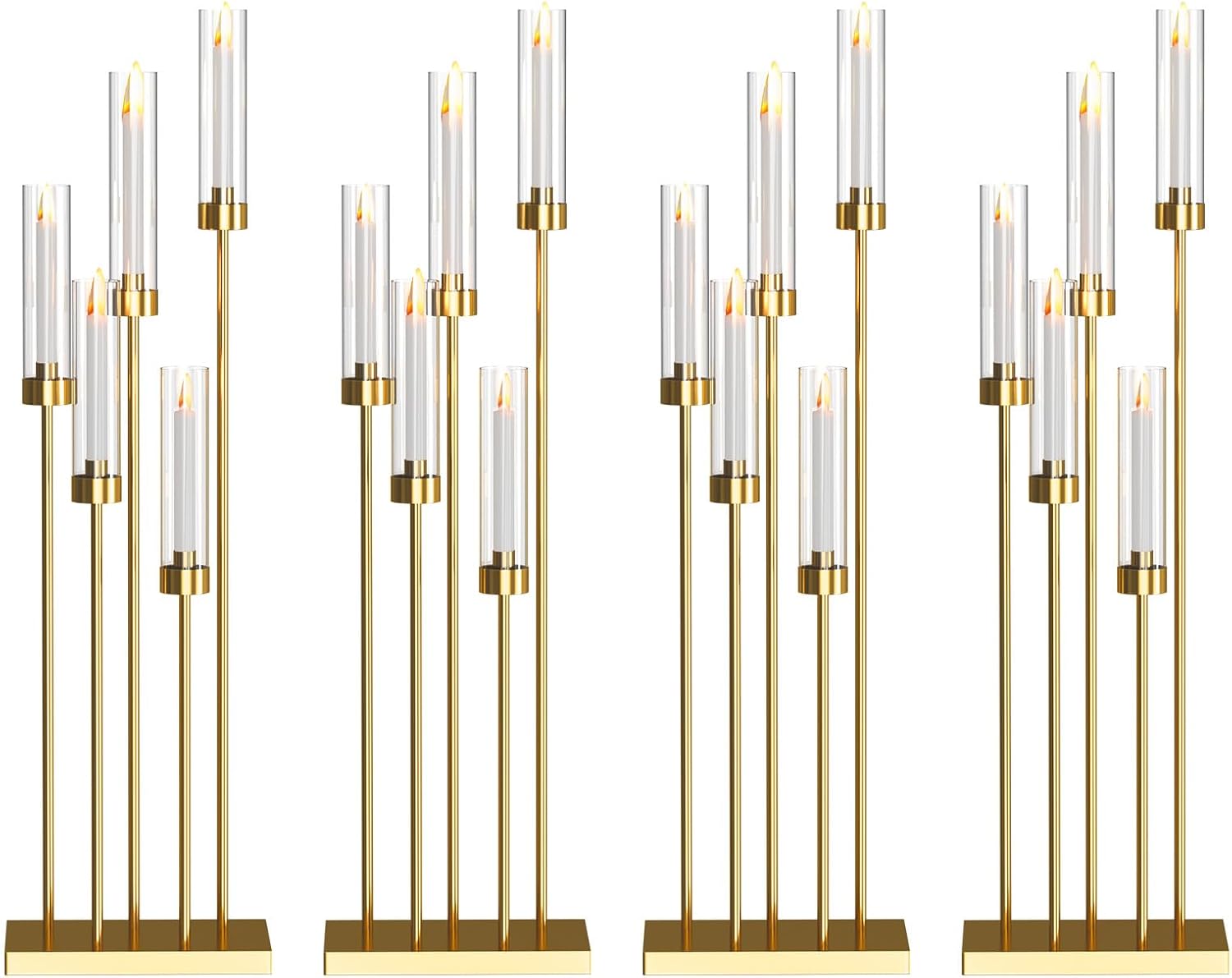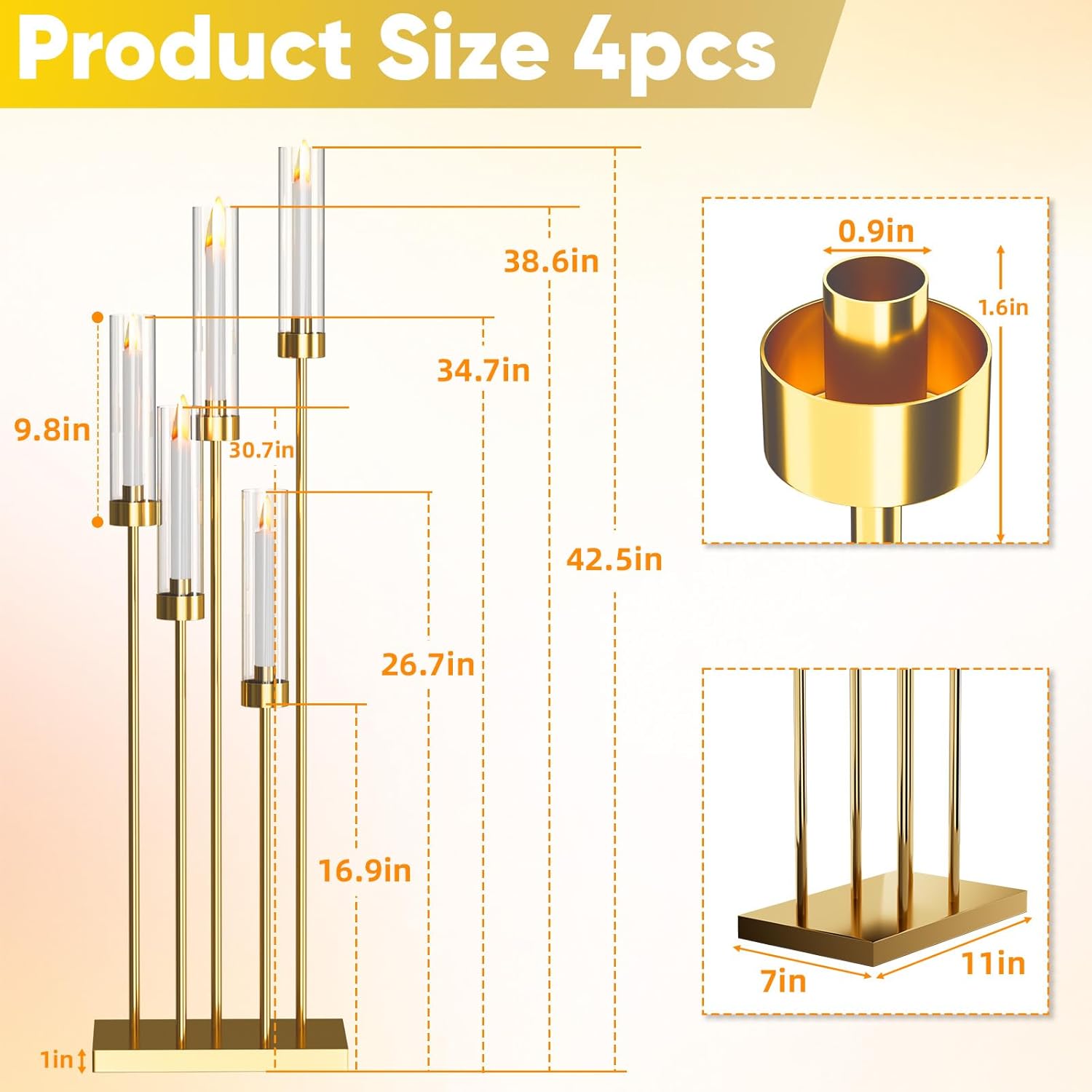 • UNIQUE DESIGN: Our 4pcs floor candle holders for wedding is 5 arms, staggered, very unique, the appearance is golden, elegant and noble. The matching transparent acrylic cover adds a bit of elegance to the whole product. Note: Our products feature a protective film on the bottom. Simply peel it off to reveal the gold finish. This film is included to prevent scratches on the product
