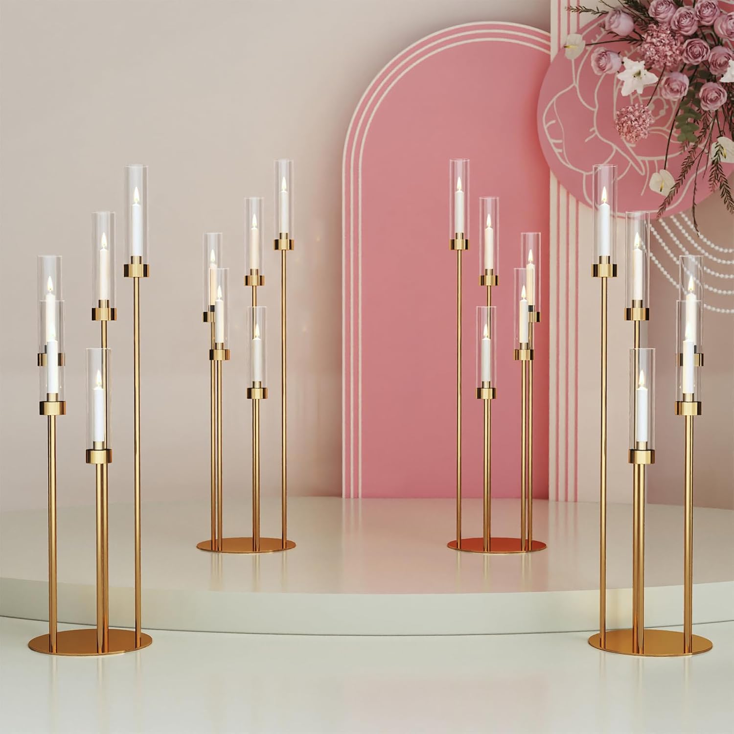 • UNIQUE DESIGN: Our 4pcs floor candle holders for wedding is 5 arms, staggered, very unique, the appearance is golden, elegant and noble. The matching transparent acrylic cover adds a bit of elegance to the whole product. Note: Our products feature a protective film on the bottom. Simply peel it off to reveal the gold finish. This film is included to prevent scratches on the product