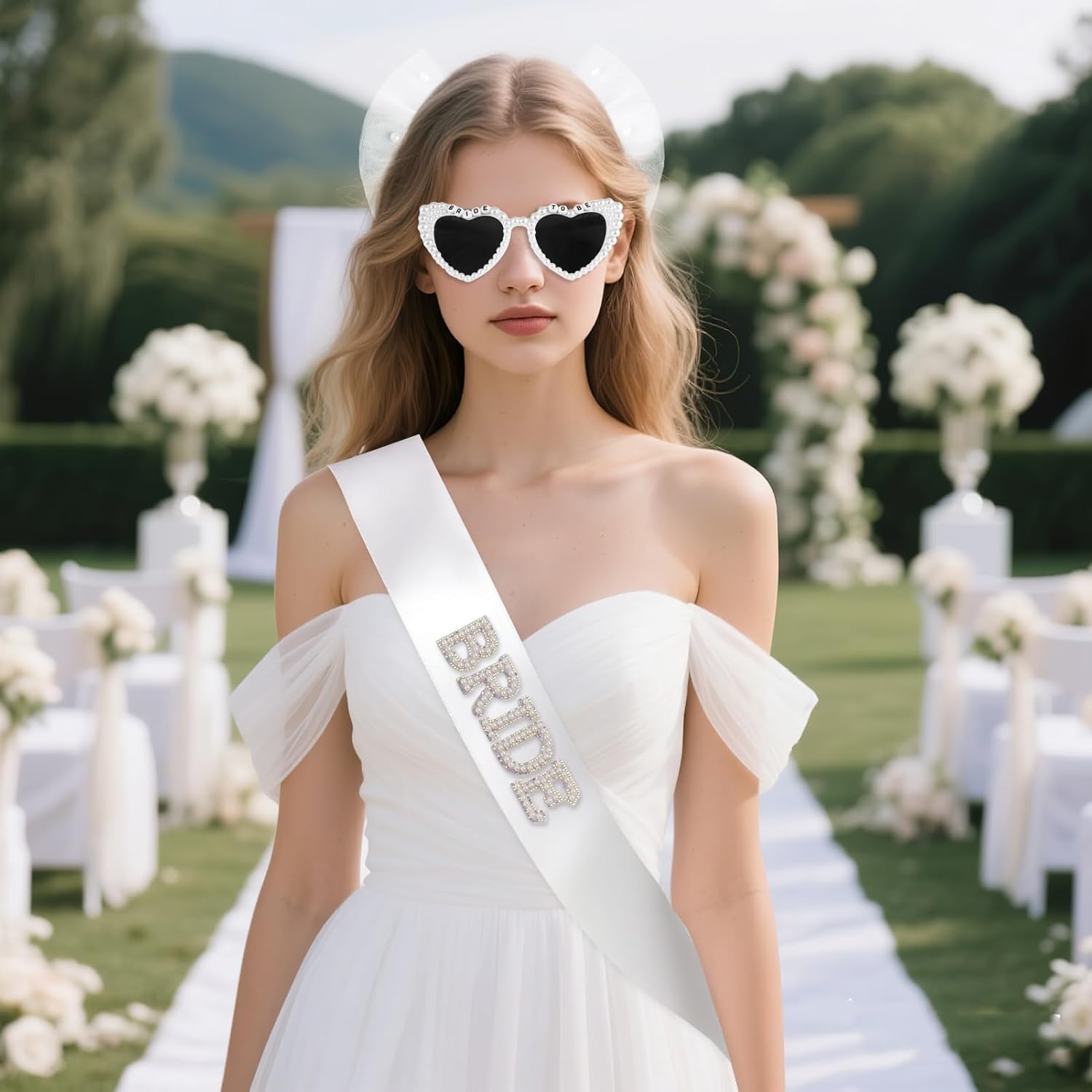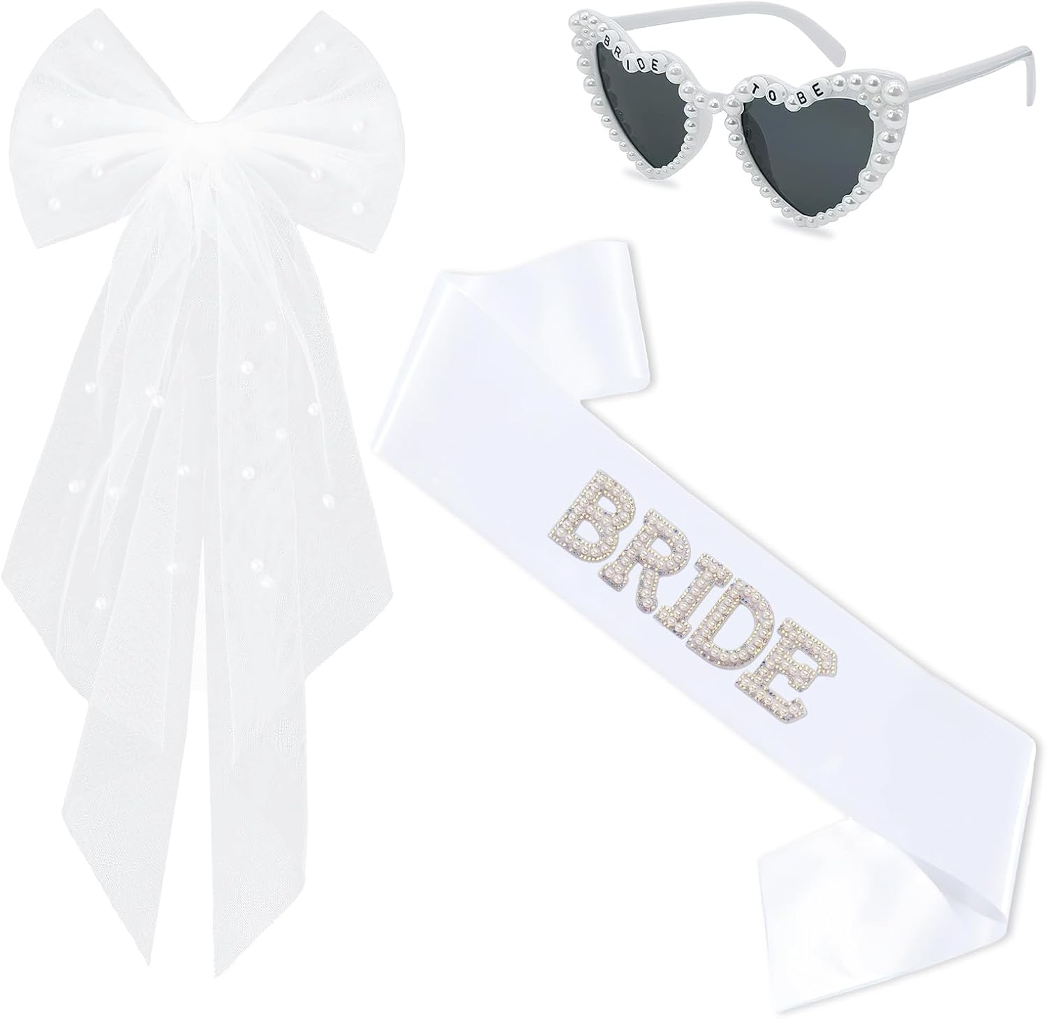 3Pcs Bride to Be Sash and Bow Veil Set, Bachelorette Party Favors, White Pearl Bride To Be Sash, Pearl Heart Sunglasses for Bachelorette Party Gifts Bridal Shower Wedding
