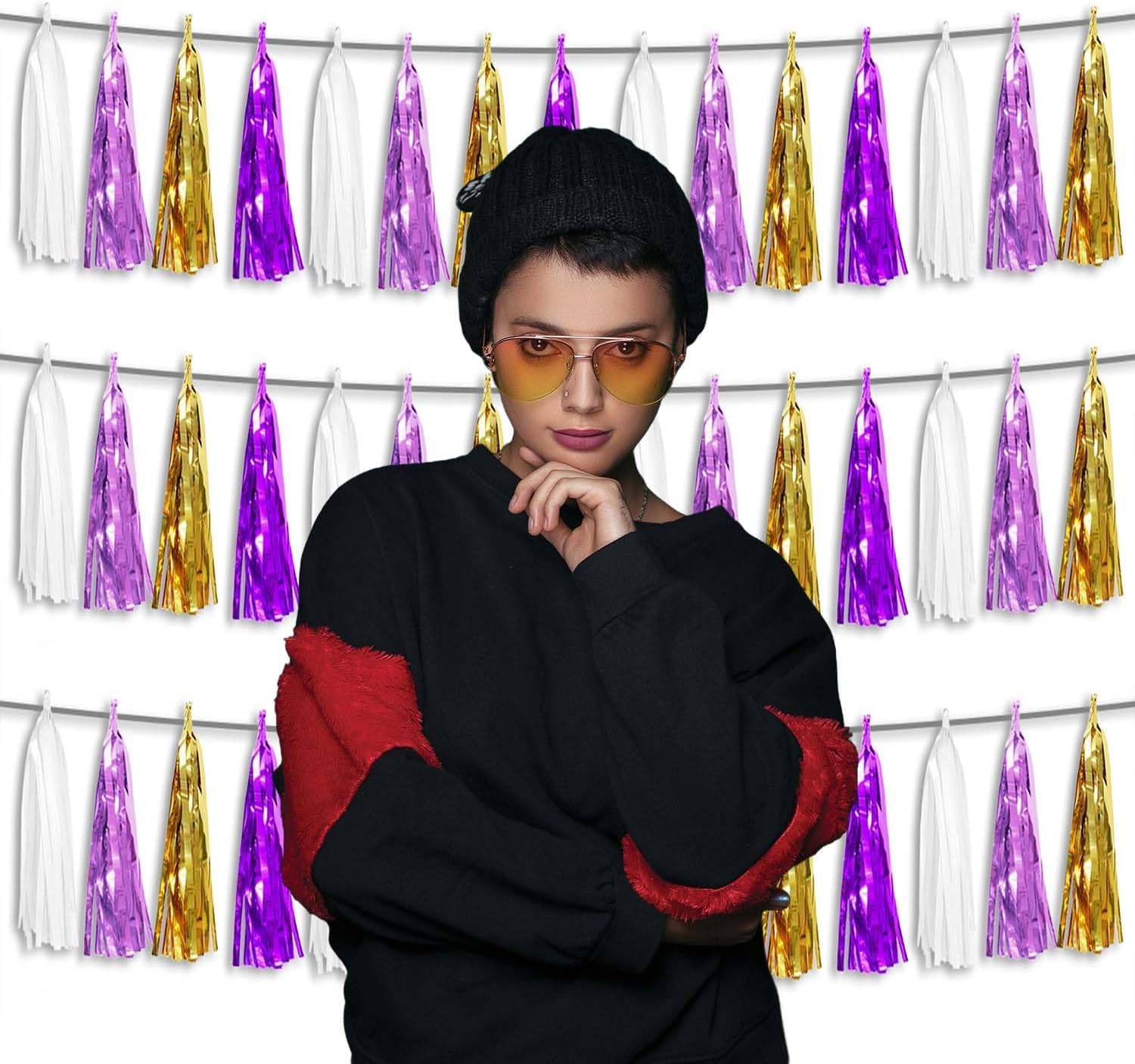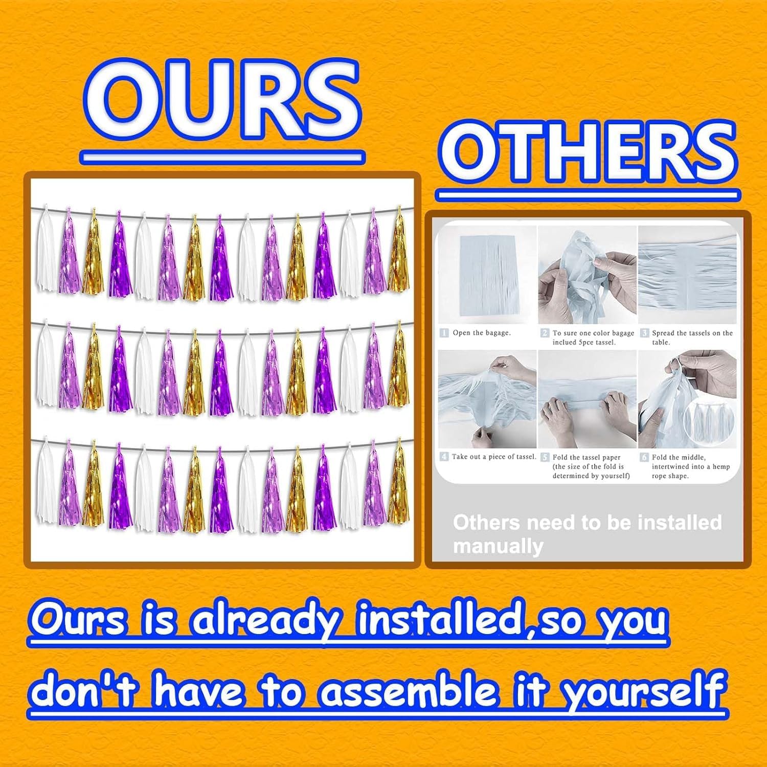 • 【Package Includes】The total length of them Purple Gold birthday tassels banner is 30 feet, divided into 3 strips, each 10 feet long. Each banner contains 15 tassels, and each tassel measures 14 inches, for birthday decorations many occasions uitable for Patriotic display, Homecoming Float, Christmas Float, ecorative metal trailers, graduation floats etc