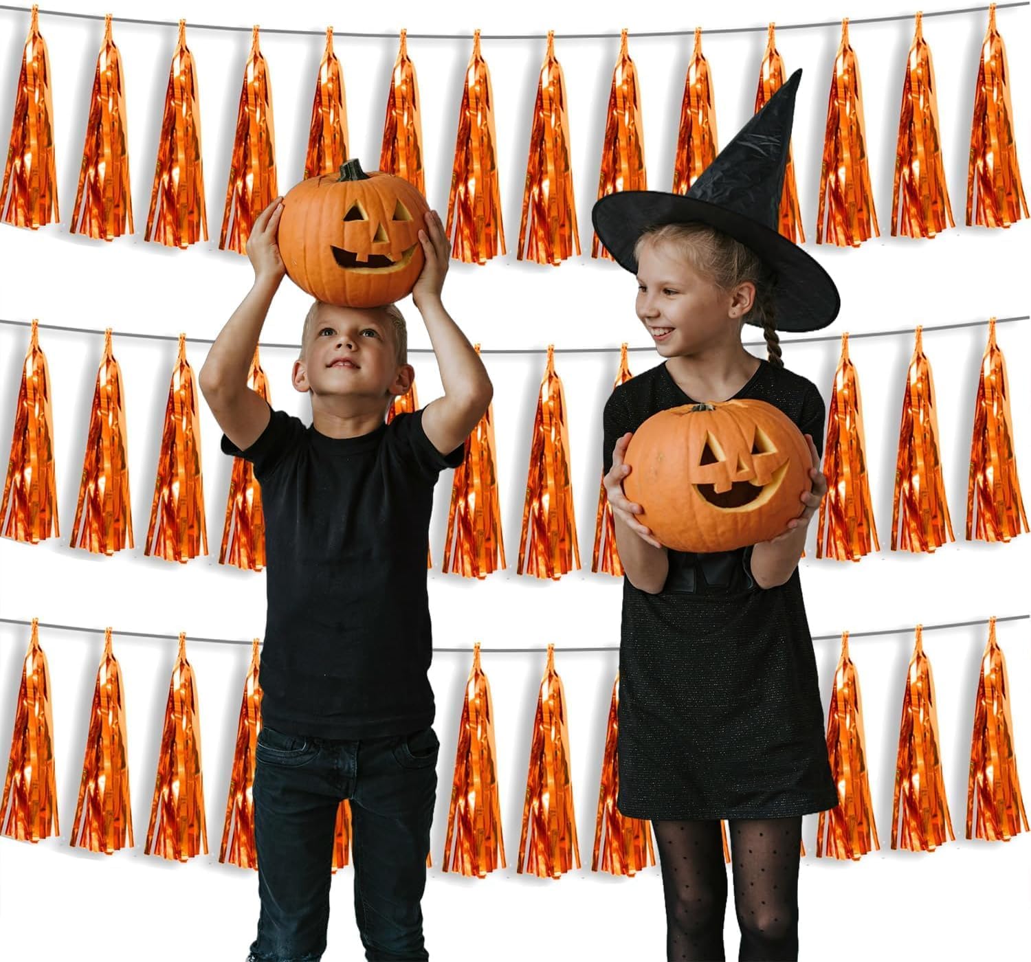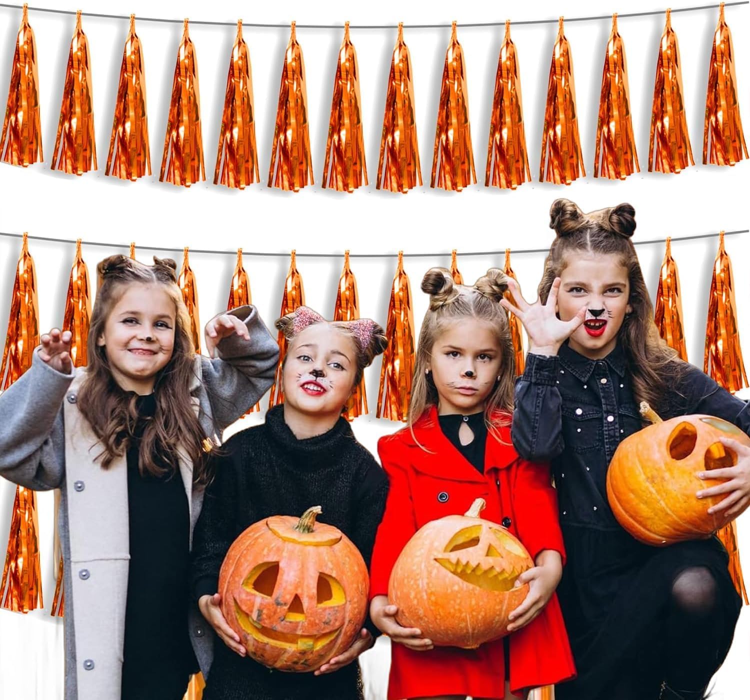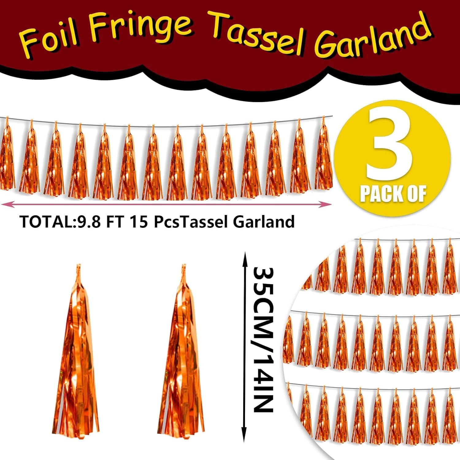 3P Metallic Fringe Tassel Banner Garland Foil Tinsel Streamer Wall Hanging Curtain Backdrop Banner for Parade Floats, Halloween Decorations, Christmas Day, Fall, Thanksgiving Party Decoration(Orange)