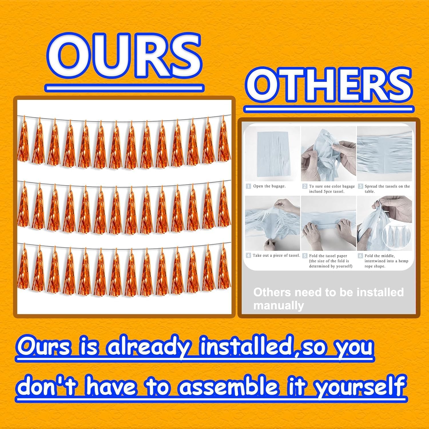 • 【Package Includes】The total length of the orange birthday tassels banner is 30 feet, divided into 3 strips, each 10 feet long. Each banner contains 15 tassels, and each tassel measures 14 inches, for birthday decorations many occasions uitable for Patriotic display, Homecoming Float, Christmas Float, ecorative metal trailers, graduation floats etc