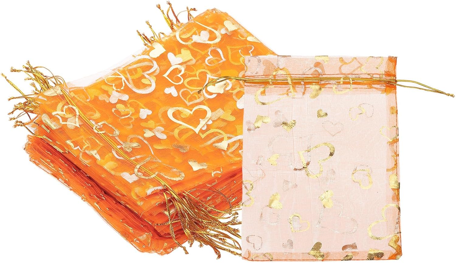 • Color: Orange; Material: Polyester; Size: 18x13 cm/7.09x5.12 Inch(L*W); Packing List: 100 Pcs x Heart Printed Organza Bags (NOTE: Please confirm the size before choosing our product)