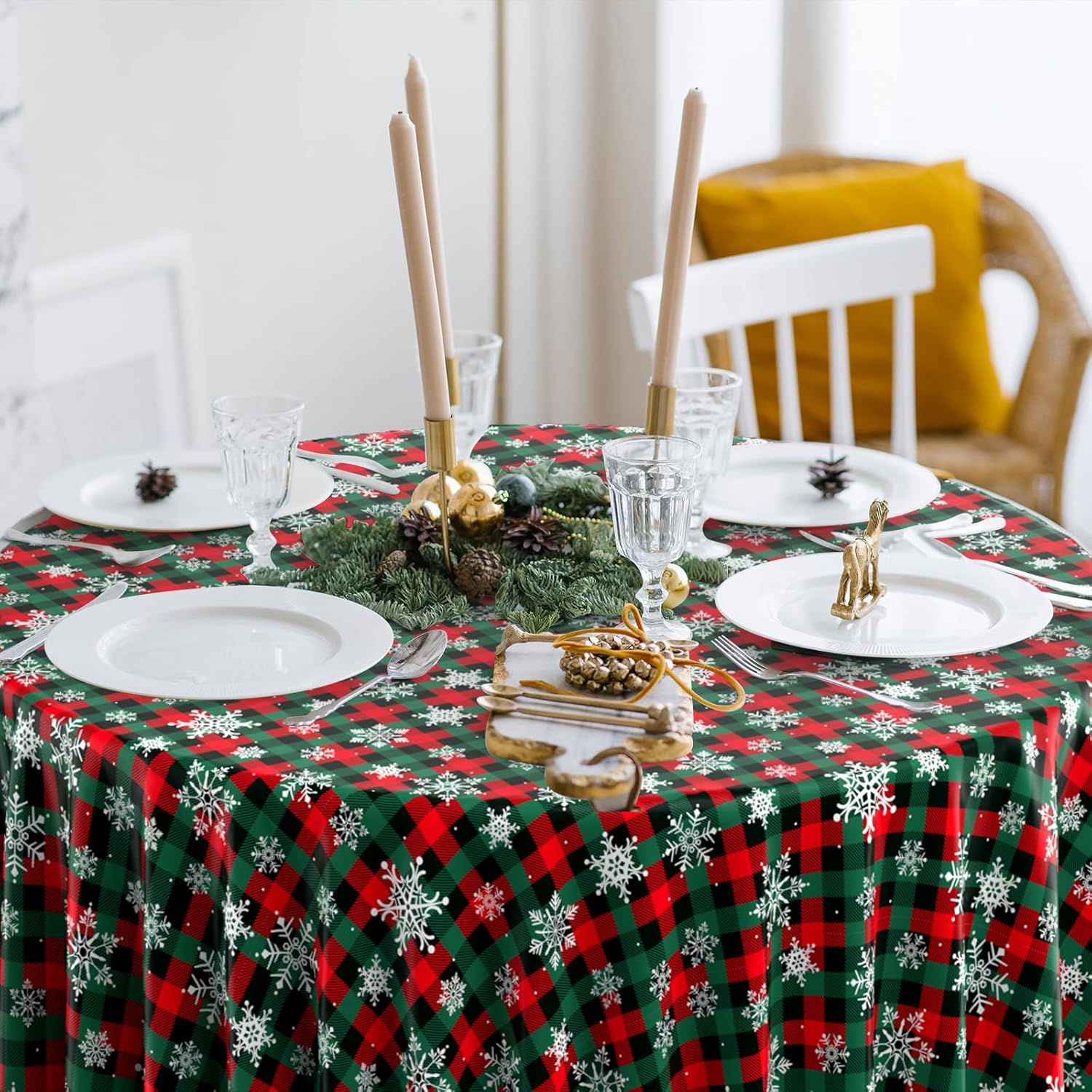 Jectivs 3Pcs Christmas Buffalo Plaid Snowflake Party Tablecloths Decorations,Plastic Red and Green Checkered Round Table Cover for Winter Christmas New Year Birthday Holiday Party Decorations,84 inch