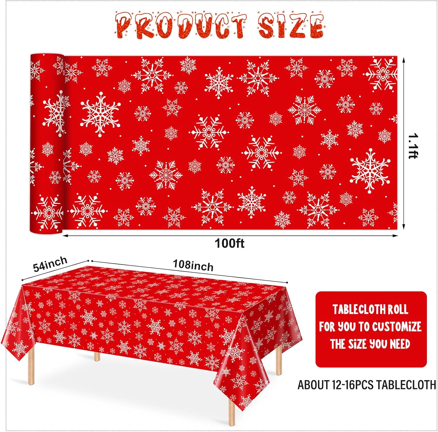 • Package include:you will get 1 roll of red Christmas plastic tablecloth,all over printed with white snowflake patterns on bright red backdrop,ideal for decorating your winter holiday and Christmas party supplies and decorations