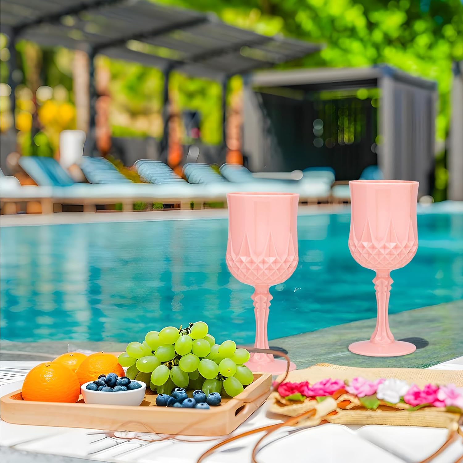 • Vibrant Solid Color Plastic Goblets: Unlike ordinary transparent or sheer-colored plastic wine glasses, our plastic vintage wine glasses drinking glasses feature rich, true solid colors that will not faded or peeled. Plastic goblets with classic diamond - pattern texture show the elegance of vintage crystal.Whether placed under sunlight or party lights, the unbreakable wedding glassware will make your drinks and dining table look more distinctive and stylish.