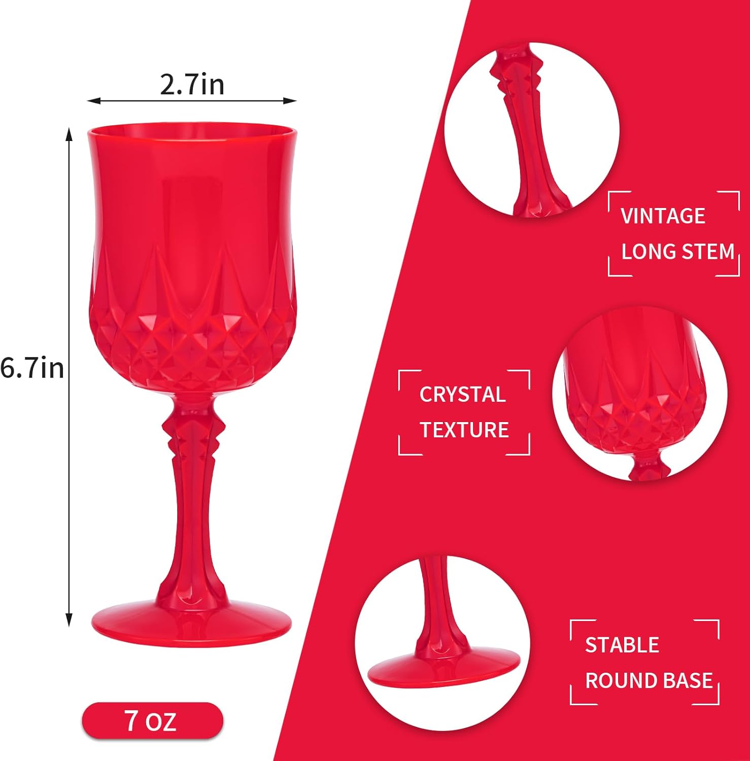 JLYLOL Plastic Vintage Wine Glasses 7OZ Plastic Goblets Vintage Drinking Glasses 24PCS Retro Wedding Glassware Water Goblets Reusable Drinking Cups for Party,Reception,Celebration,Bar,Whiskey(Red)