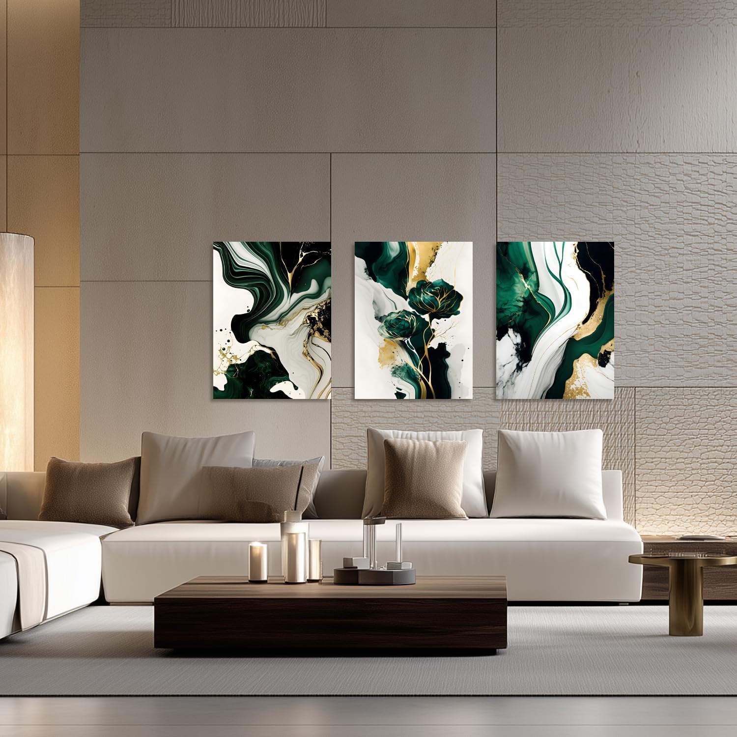• Elegant Green Abstract Design: This 12"x16" 3-piece green wall art set features a luxurious abstract pattern in emerald and olive tones, accentuated with marbled black and shimmering gold strokes. Each panel is visually captivating, combining modern fluid aesthetics with floral-inspired shapes, creating a dynamic and rich atmosphere.
