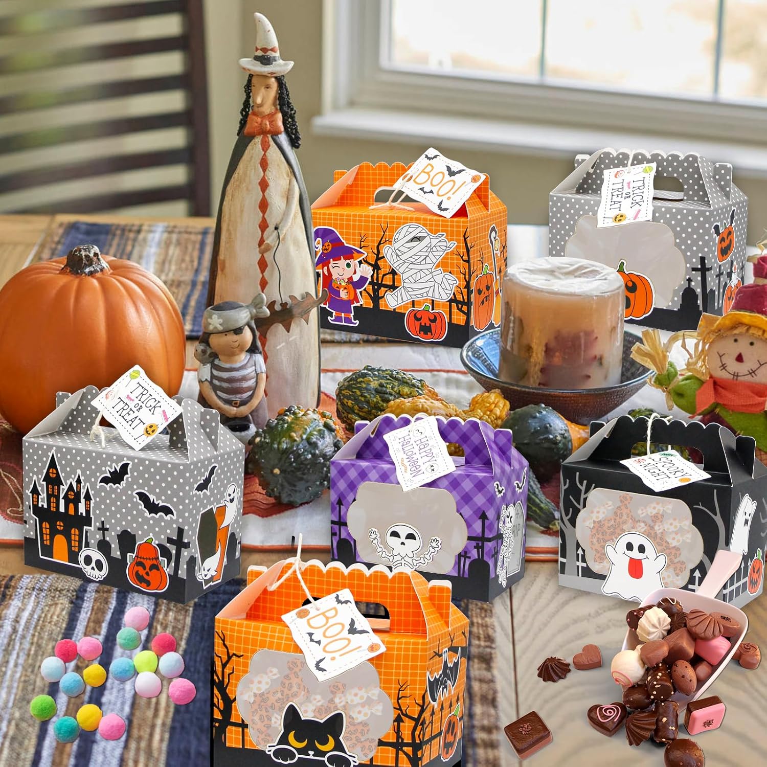 • 【24pcs Festive Halloween Goodie Box Designs】These Halloween treat boxes come in 24 pieces, each featuring charming designs like pumpkins, ghosts, black cats, and skulls. The vibrant and spooky patterns are perfect for adding a festive touch to your Halloween celebrations, making them ideal for parties, trick-or-treat events, and themed gatherings.