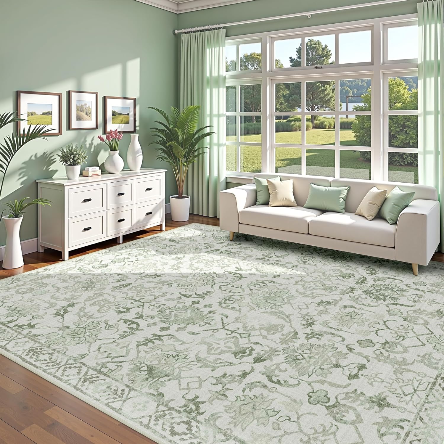 Sage Neutral Large Area Rug10x12 for Living Room, Washable Rug for Dining Room Bedroom, Anti-Slip Low-Pile and Soft Accent Rug Farmhouse Office Home Decor Light Green