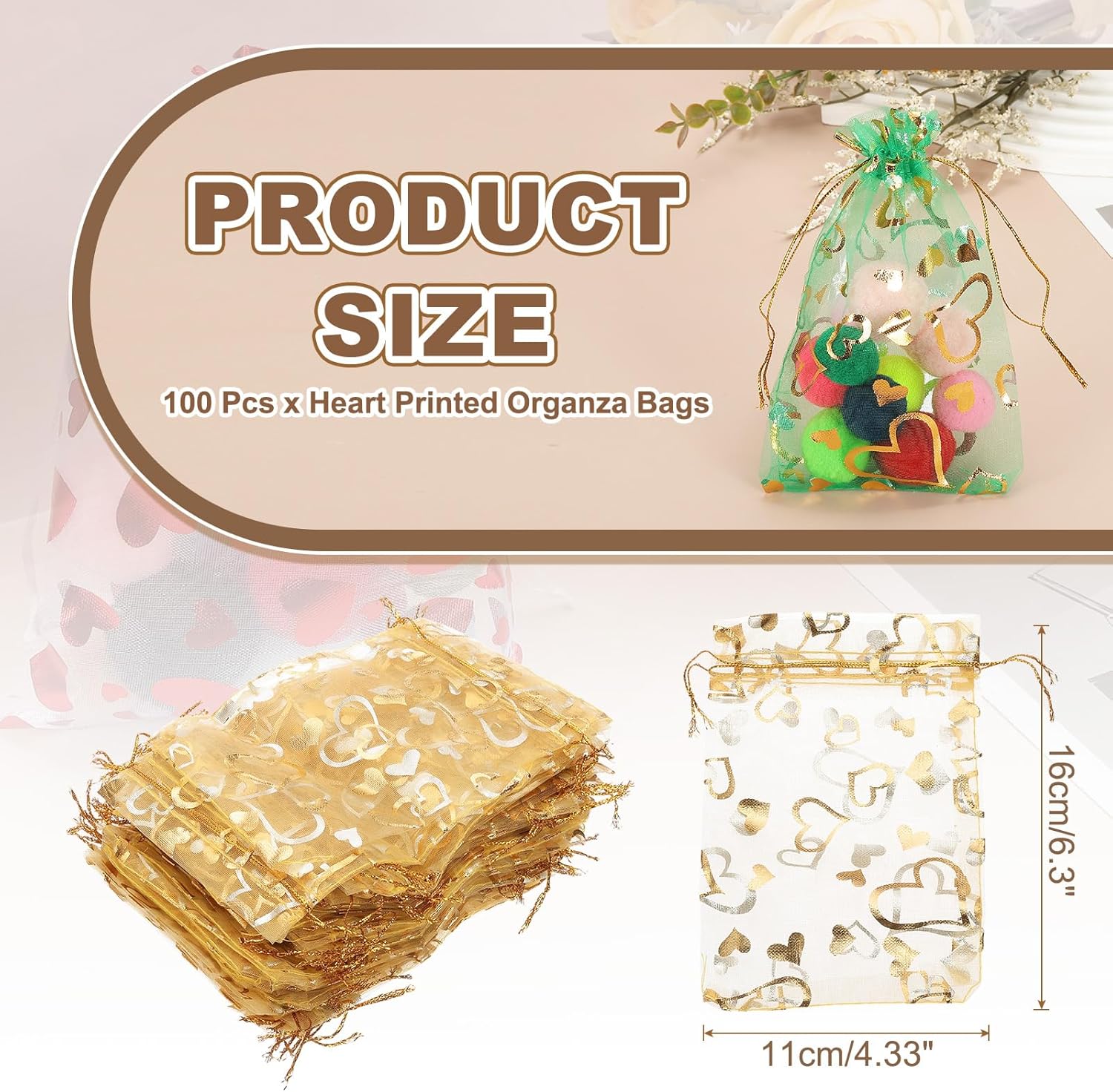 • Color: Gold; Material: Polyester; Size: 16x11 cm/6.3x4.33 Inch(L*W); Packing List: 100 Pcs x Heart Printed Organza Bags (NOTE: Please confirm the size before choosing our product)