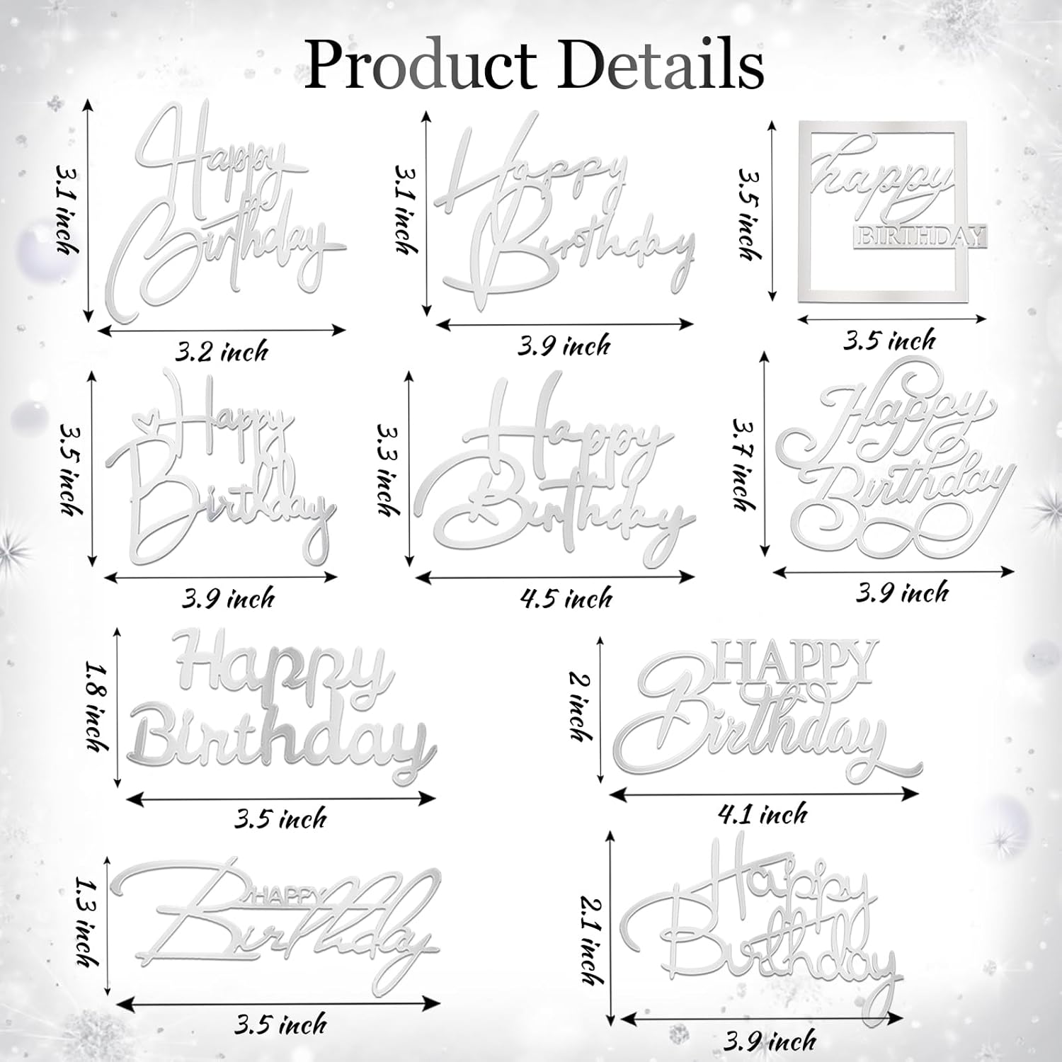 • Appropriate size: Double-sided mirror happy birthday cake topper is approx. 3.5 inch in width and the height is approx. 3 inch in height, suitable for most cakes.Tips:Our products have protective films on both sides. Please gently remove them to prevent the acrylic from breaking