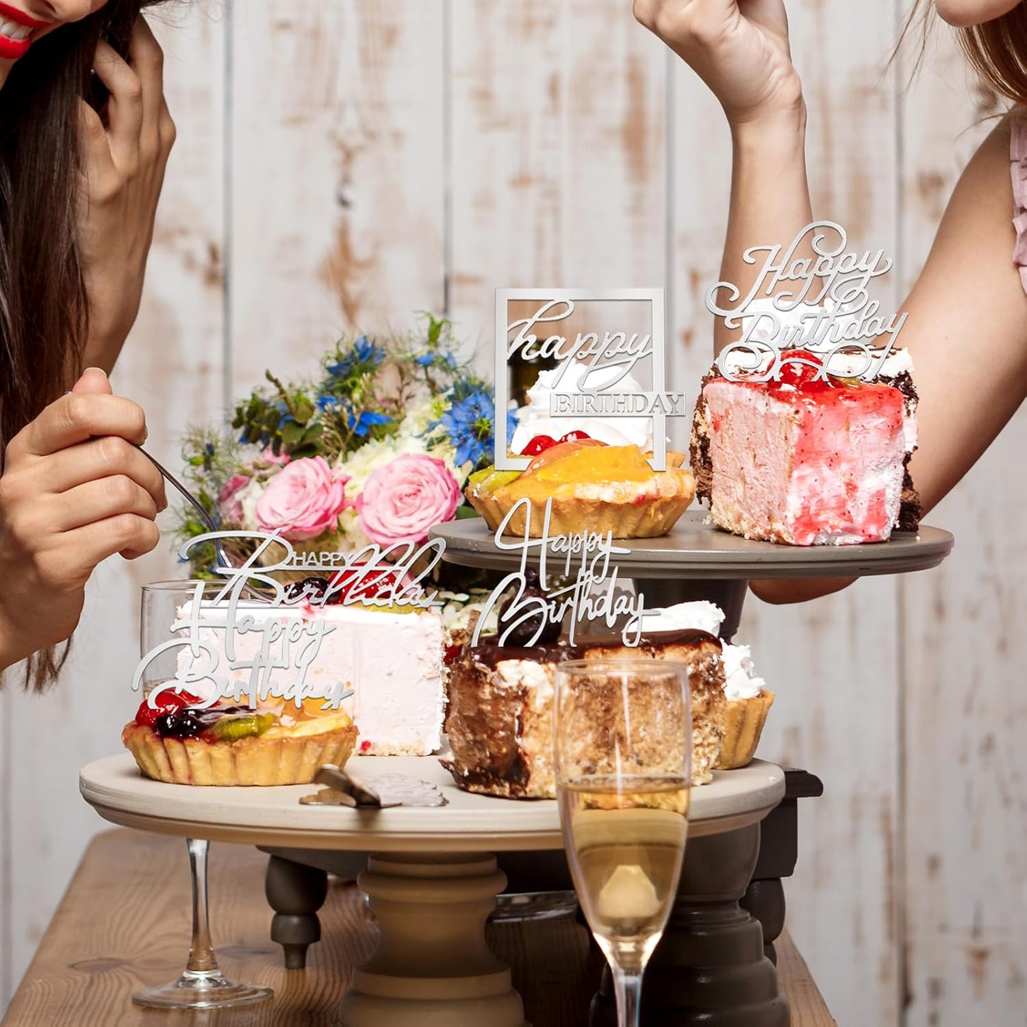 10 PCS Silver Happy Birthday Cake Topper Mirror Acrylic Cake Toppers Double-Sided Glitter Birthday Decorations for Girls Women's Party Supplies
