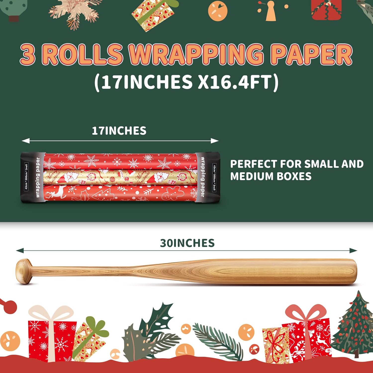 • [3 Packs 16.4ft Christmas Gift Paper] There are a total of 3 rolls of Christmas gift paper, each roll is 17 inches wide and 16.5ft long, totaling 70 square feet! Very suitable for family gift giving and gift giving between friends!