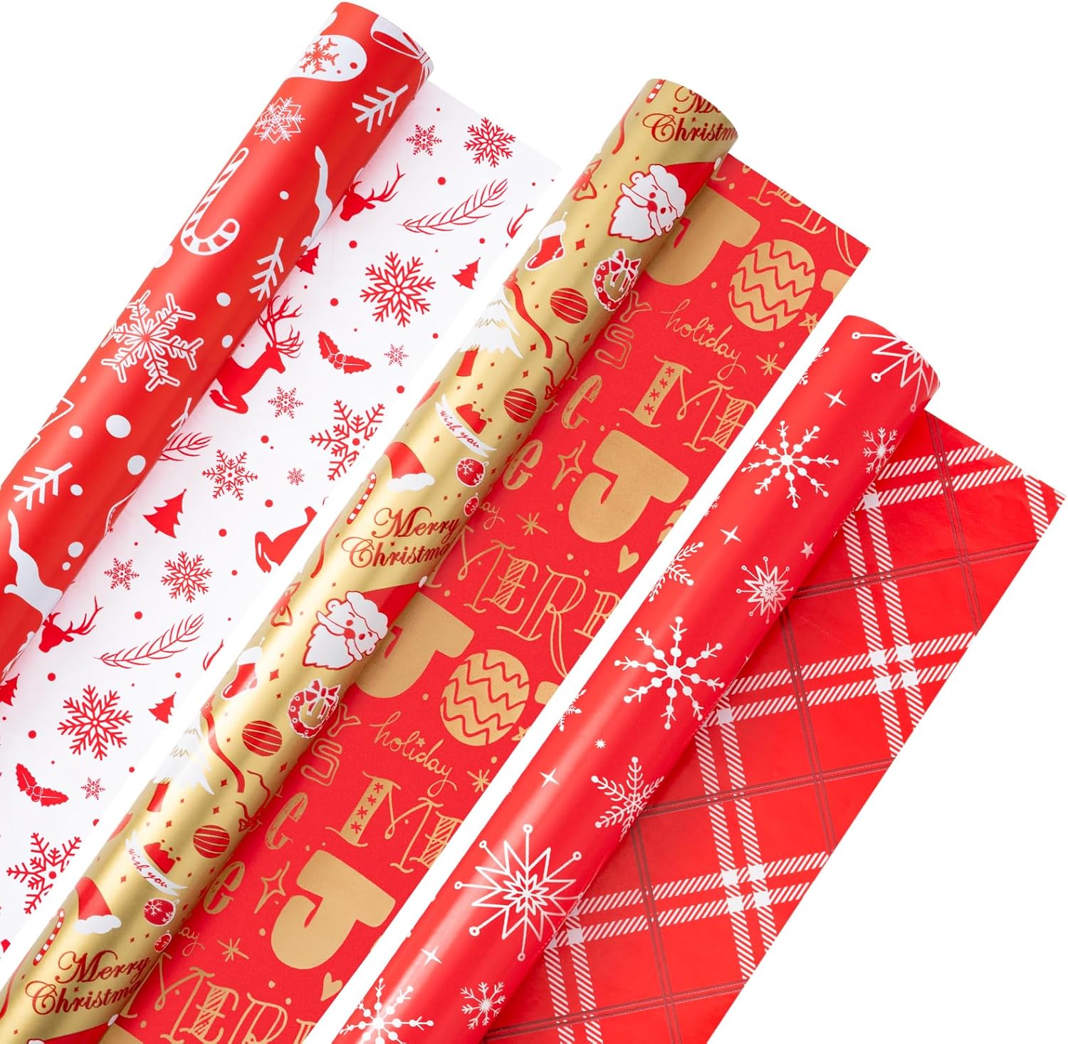 Christmas Gift Wrapping Paper Rolls,3 Rolls 17inches x 198inches Reversible Gift Wrapping Paper, Red Gold White Wrapping Paper, Snowflakes, Stripes, Plaid, Santa hat, Christmas decorations